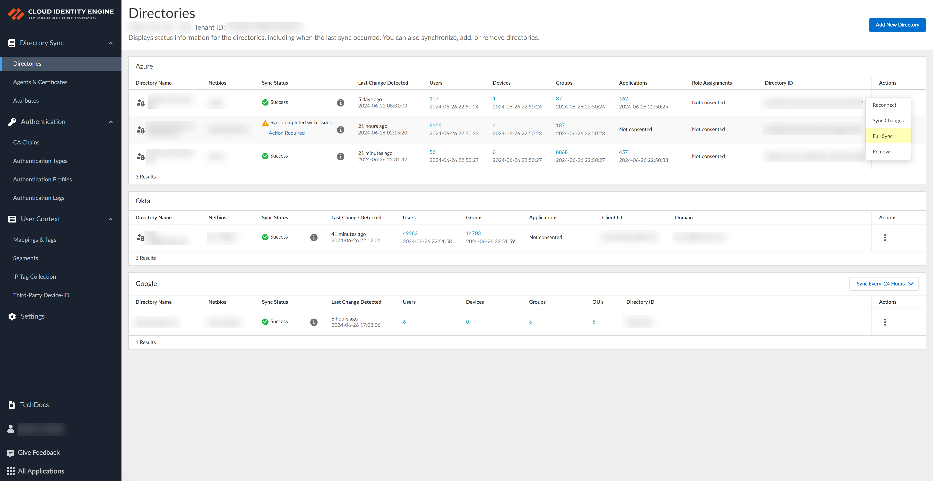 The sync may take some time to complete, so make sure you click Sync Changes only once. We recommend a full sync of your directory if you lose connectivity or are experiencing issues. To sync the entire directory, Synchronize All Attributes in a full sync. If a full sync is in progress, you cannot sync changes. After a full sync completes in the Cloud Identity Engine app, the firewall must also complete a full sync.Set Synchronization Interval