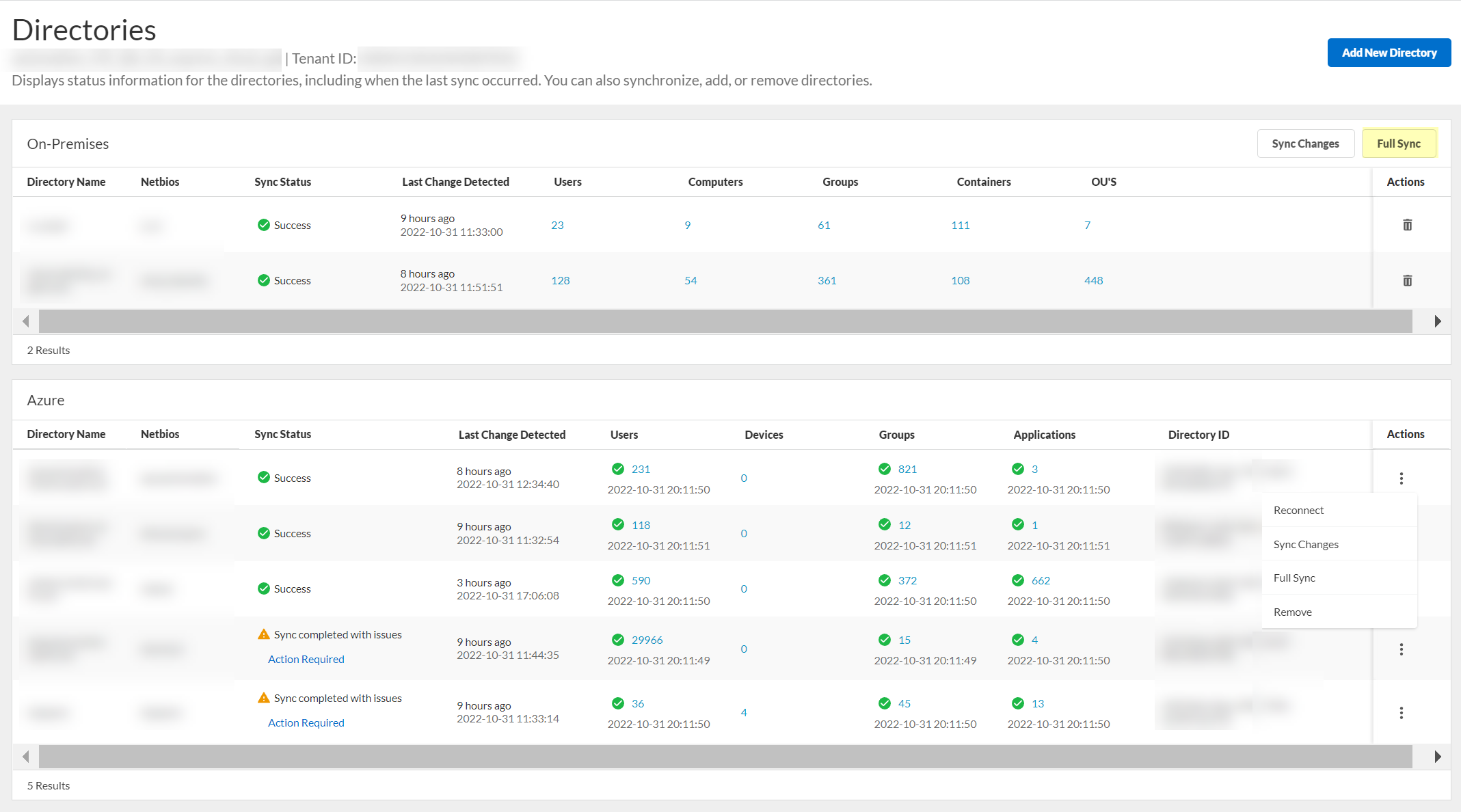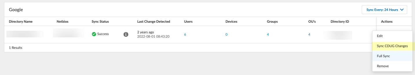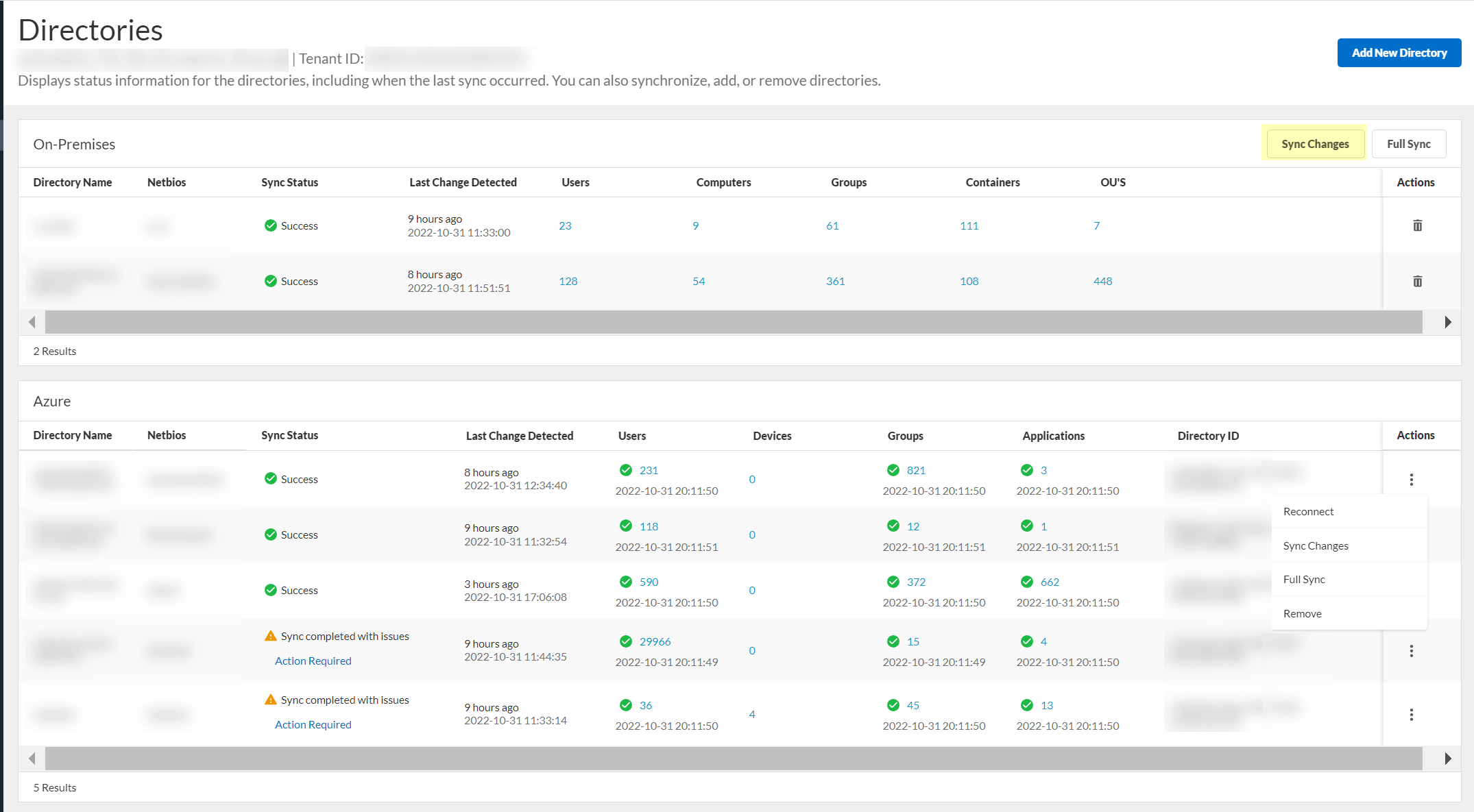 You can sync just the changes to your directory, which is much faster than a full sync of your directory. By default, the Cloud Identity Engine syncs changes for most attributes every five minutes unless a sync is already in progress.The Sync Status on the Directories page may incorrectly indicate Success while an incremental sync is still in progress. The synchronization automatically captures any changes made in the directory but it is not possible to initiate another sync while a sync is currently in progress.For Azure Active Directory (Azure AD) and Okta, the Cloud Identity Engine syncs attributes for users and groups every five minutes; for Azure AD, a sync for devices occurs daily if the previous device sync required less than 24 hours to complete. If completing the device sync required more than 24 hours, the next sync occurs at the interval of the duration for the previous device sync (for example, if the previous device sync required 26 hours, then the next sync would occur 26 hours from the previous successful sync).The Sync Changes option is not available for Google Directory.- If you have not already done so, configure a directory.After making changes to your directory, select ActionsSync Changes to sync the changes for your directory.
