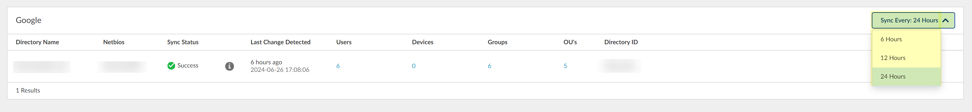 This sync option is available for Google Directory only.- Log in to the hub and select the Cloud Identity Engine app.Select the tenant you want to synchronize, then select Directories.Click Sync Every: for the directory type interval that you want to change and select the interval.