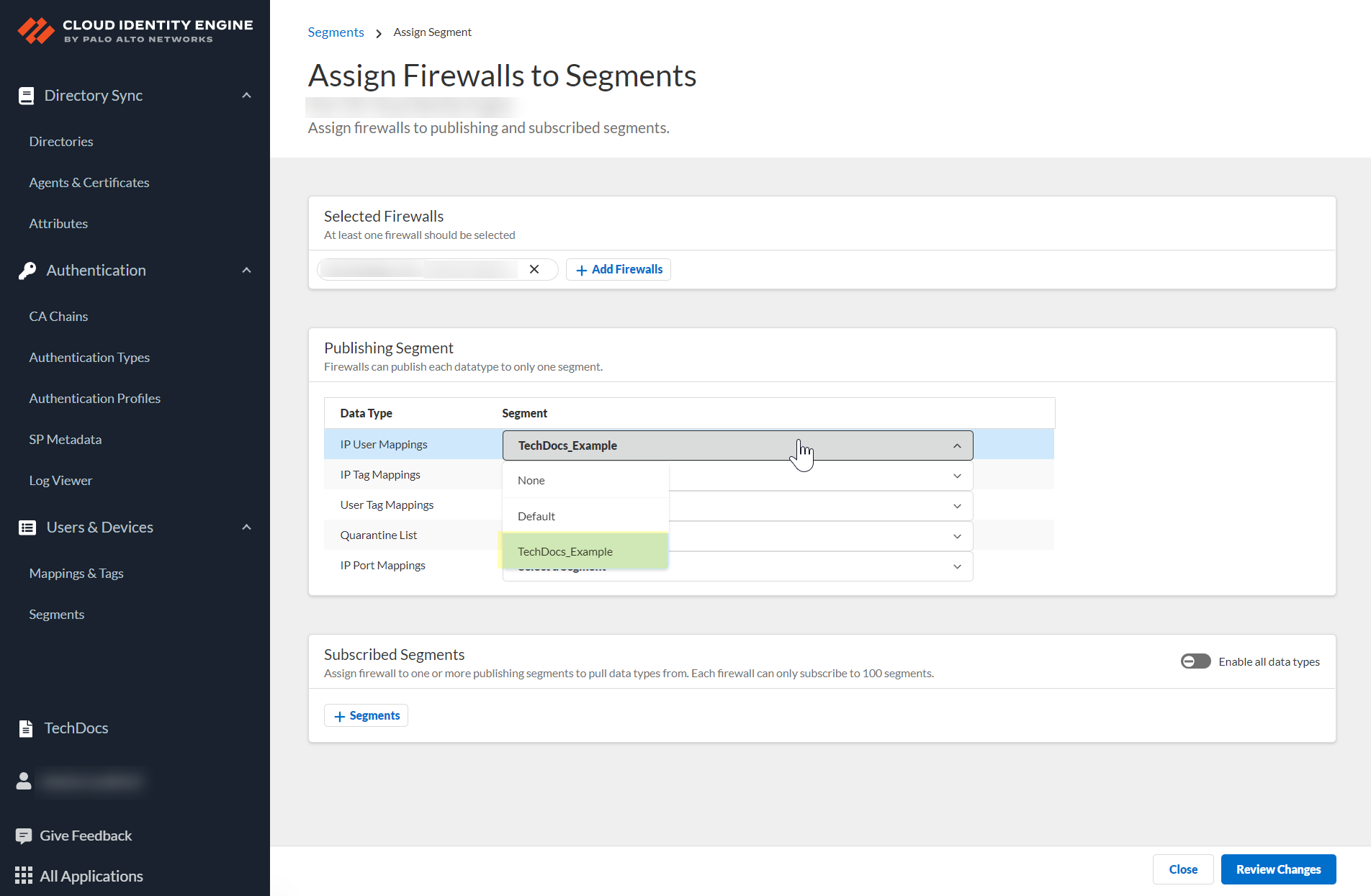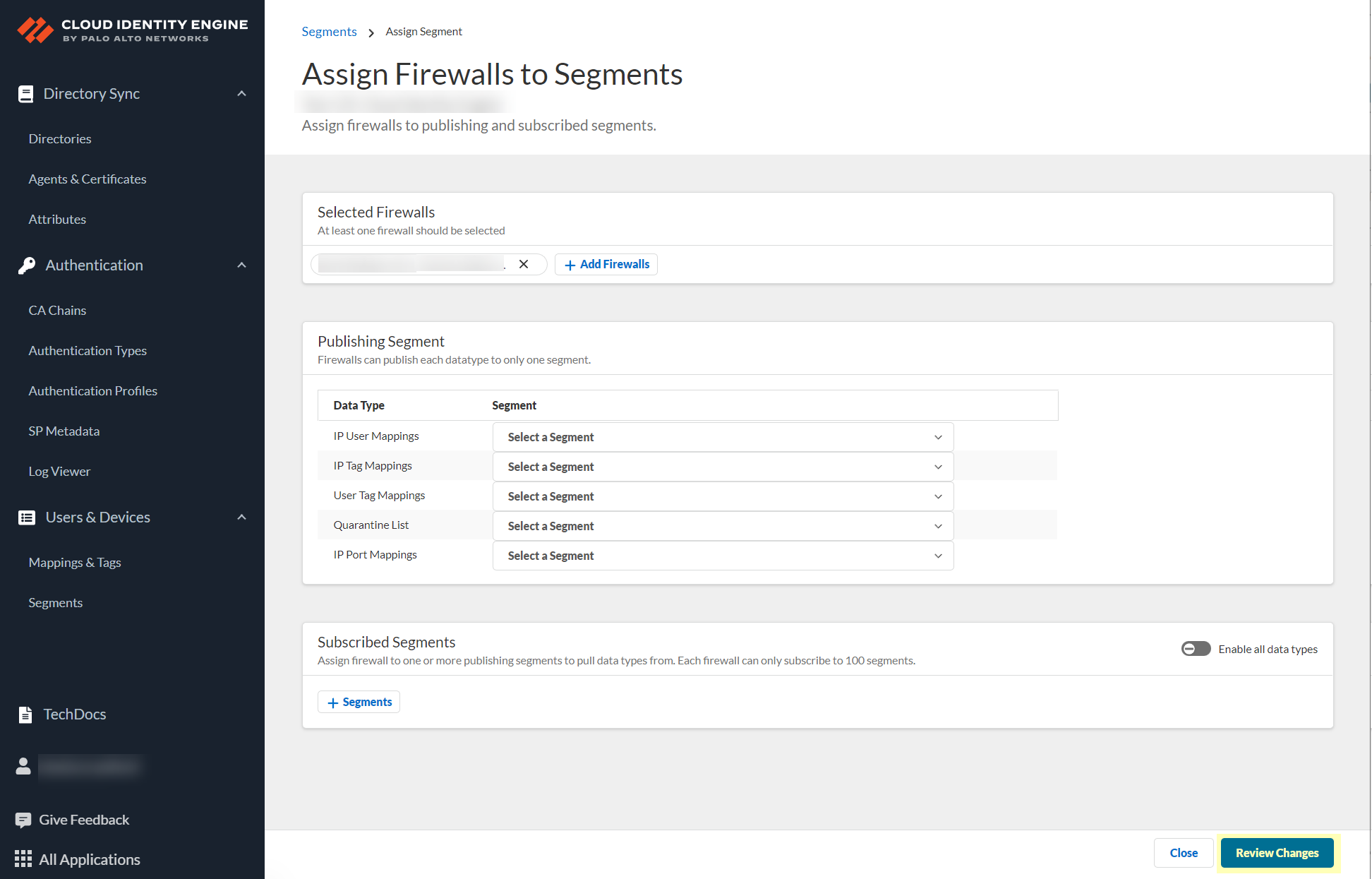 (Optional) Edit segments as needed to customize how the Cloud Identity Engine provides mappings to the firewalls.- If sharing for data type is Enabled and you do not want to share this data type in this segment, select it to change the setting to Disabled.