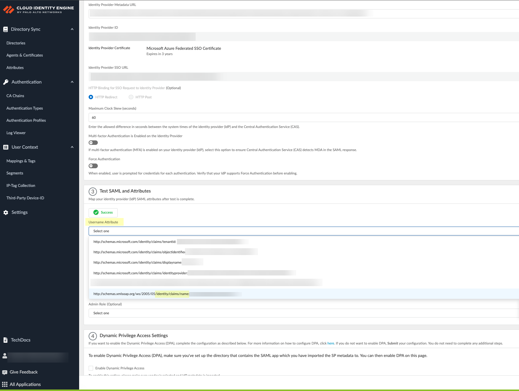 - Click Test SAML Setup to verify the configuration.Select the Username Attribute for the Cloud Identity Engine to use for authentication.Select the username attribute that uses the Name (/identity/claims/name:) format. If you do not select the correct username attribute, user authentication for projects is not successful. For more information, refer to the Microsoft documentation.