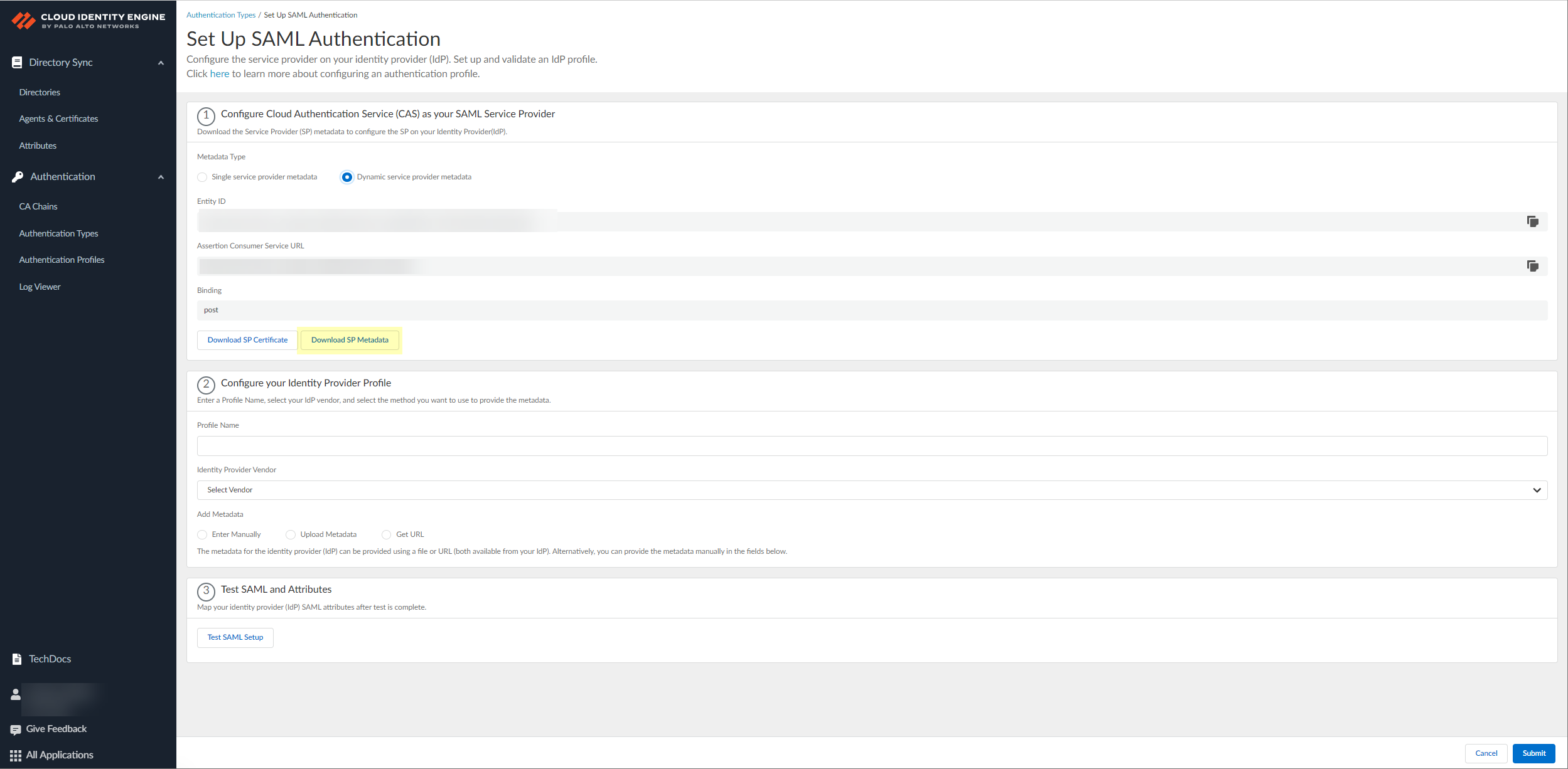 (Optional) Select other attributes to use for authentication, such as Usergroup Attribute, Access Domain, User Domain, and Admin Role.If you have not already done so, Collect enterprise applications data from your Azure directory. Sign in to confirm the changes and Submit the update to the configuration.The Cloud Identity Engine begins a complete synchronization of the attributes (also known as a full sync) when you submit the configuration. Wait until the sync is complete before continuing.This step is mandatory to complete the configuration regardless of whether you're creating a new configuration or editing an existing configuration. You must complete this step before enabling Dynamic Privilege Access in the Cloud Identity Engine.Enable Dynamic Privilege Access in the Cloud Identity Engine authentication profile.- Select Enable Dynamic Privilege Access.Click Detect Directory and SAML to allow the Cloud Identity Engine to detect available directories and SAML attributes.When the Cloud Identity Engine completes the collection of the attributes, the Directory and SAML 2.0 Application information displays.If the Cloud Identity Engine can't detect the SAML application, complete a full sync then reattempt this step.After confirming the information is correct, Submit the configuration.Configure an authentication profile in the Cloud Identity Engine to use the authentication type you configured.