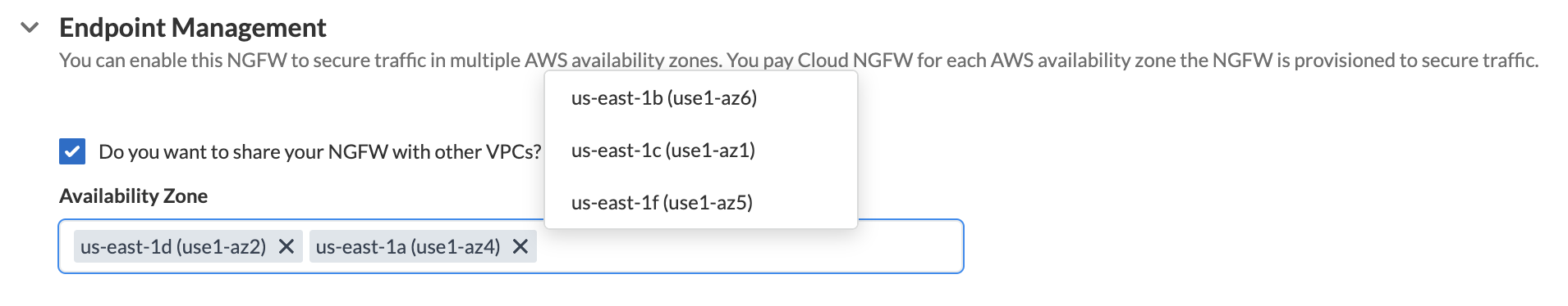 In the Endpoint Management section, you can enable your Cloud NGFW for securing traffic in multiple AWS availability zones. You pay for each AWS availability zone that your NGFW is provisioned to secure traffic. You can manage how the endpoints are created for your NGFW in these availability zones. You pay AWS for each VPC (gateway load balancer) endpoint that you create for your NGFW.The Availability Zone displays the Zone ID and the corresponding Availability Zone Name in your Palo Alto Networks account. Use this information when mapping your availability zones to your AWS accounts.
