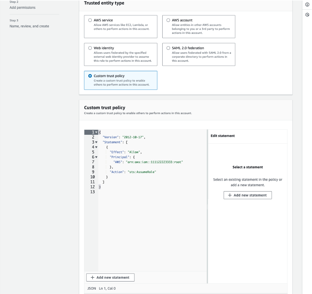 Create a new role with custom trust policy.The following is an example of a custom trust policy:{ "Version": "2012-10-17", "Statement": [ { "Effect": "Allow", "Principal": { "AWS": "arn:aws:iam::111122223333:root" }, "Action": "sts:AssumeRole" } ] }