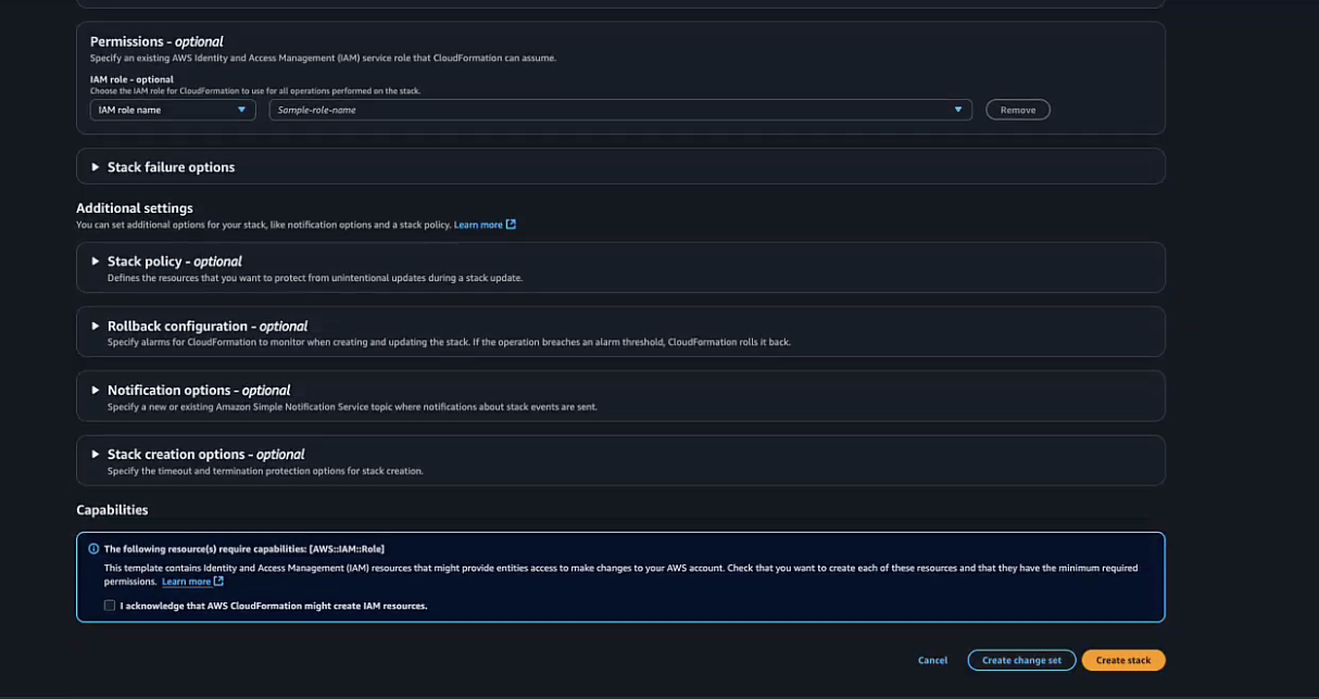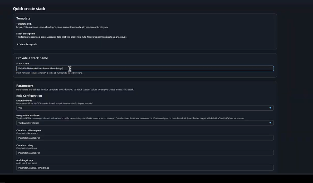 Configure the CloudFormation Stack.- Once redirected to the Quick create stack page in AWS, verify that the Template URL is correctly pre-populated. The Stack name field will also be pre-filled; you can keep the default name.