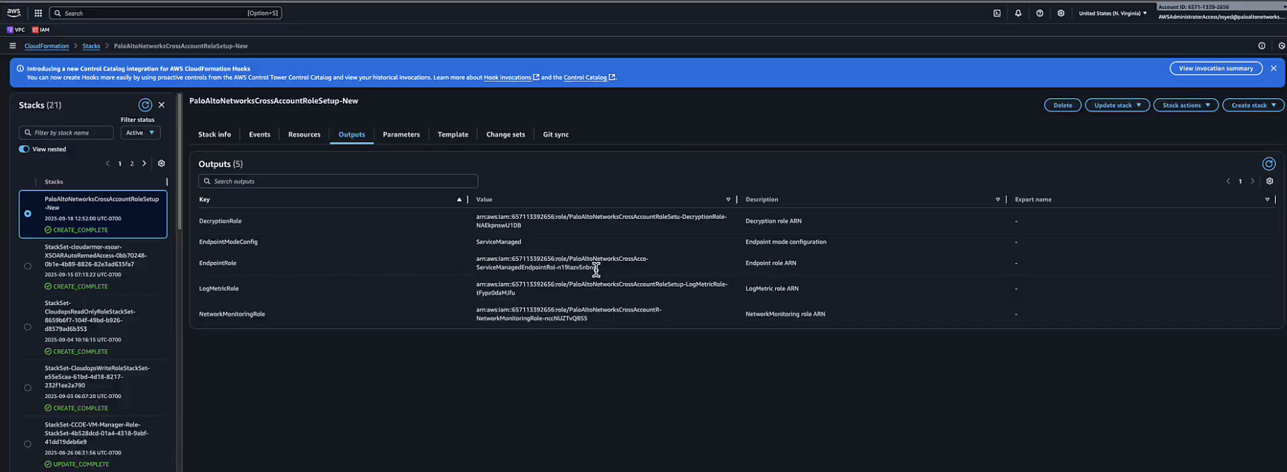 - The Outputs tab contains key information needed to complete the onboarding, such as the EndpointRoleARN, LoggingMetric Role, and Deployment Role.