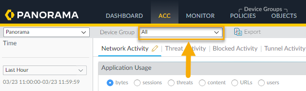 The ACC is an analytical tool that provides actionable intelligence about the activity within your network. The ACC uses the Cloud NGFW logs to graphically depict traffic trends on your network. The graphical representation allows you to interact with the data and visualize the relationships between events on the network including network usage patterns, traffic patterns, and suspicious activity and anomalies.In Panorama, you can filter ACC content based on Cloud Device Group. To learn how to filter and view specific information about activity on your Cloud NGFW resources, see the ACC documentation for PAN-OS.- Log in to Panorama.Select ACC.From the Device Group drop-down, select the Cloud Device Group to view activity.