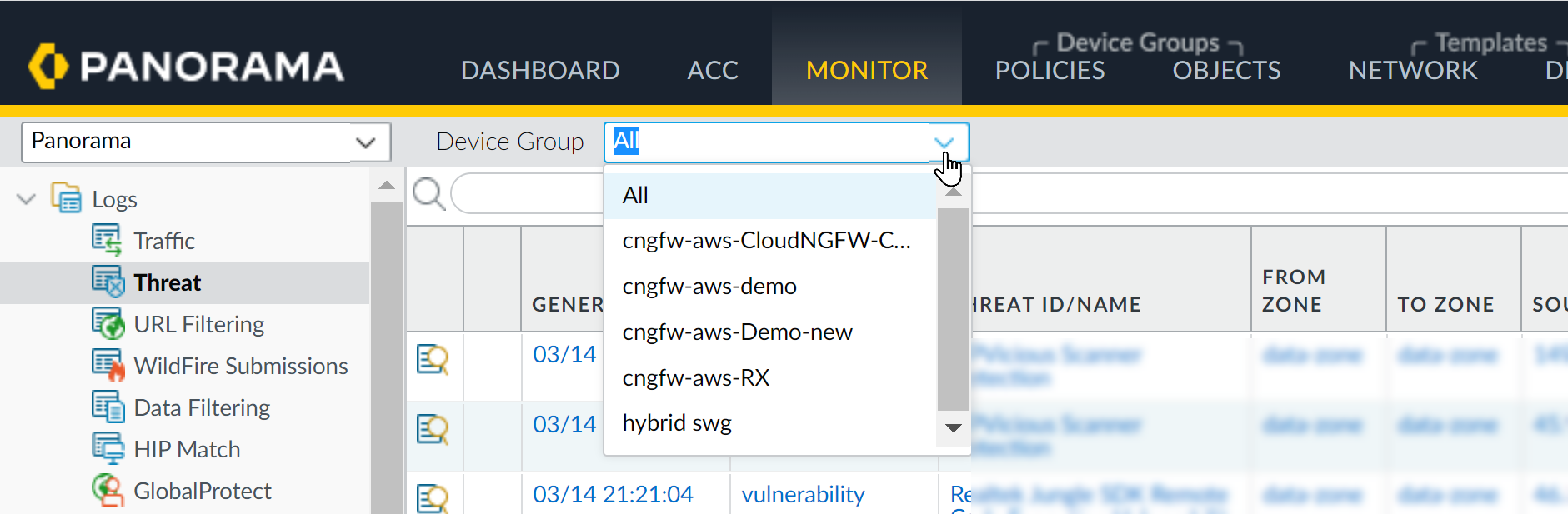 - Log in to Panorama.Select Monitor.From the Device Group drop-down, select the Cloud Device Group to view activity.You can use a Panorama filter to view the log of an individual Cloud Device Group. Locate the Device Name. Click the + icon in the upper right portion of the Panorama interface to add a new filter. Enter the name for the filter, then click Save. Click the Load Filter icon. Select the newly created filter to display the logs for the individual Cloud Device Group.From the Logs menu on the left side on the Panorama console, you can choose a specific type of log to view.