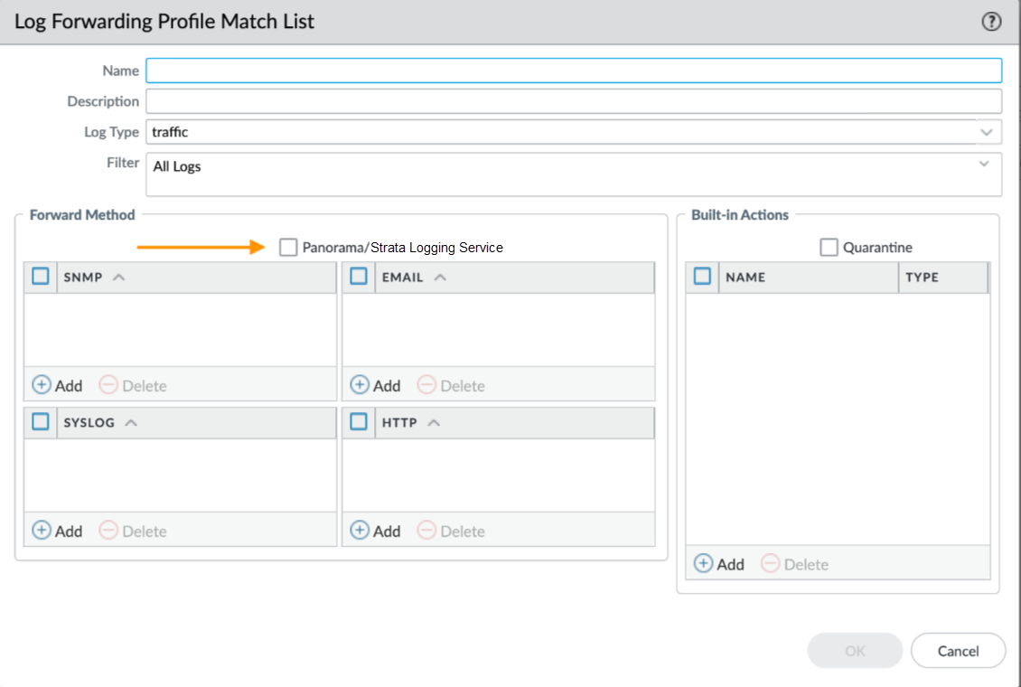 In the Log Forwarding Profile Match List screen, specify a name for the log.Select a Log Type from the drop-down.Select Panorama/Strata Logging Service as the Forward Method.