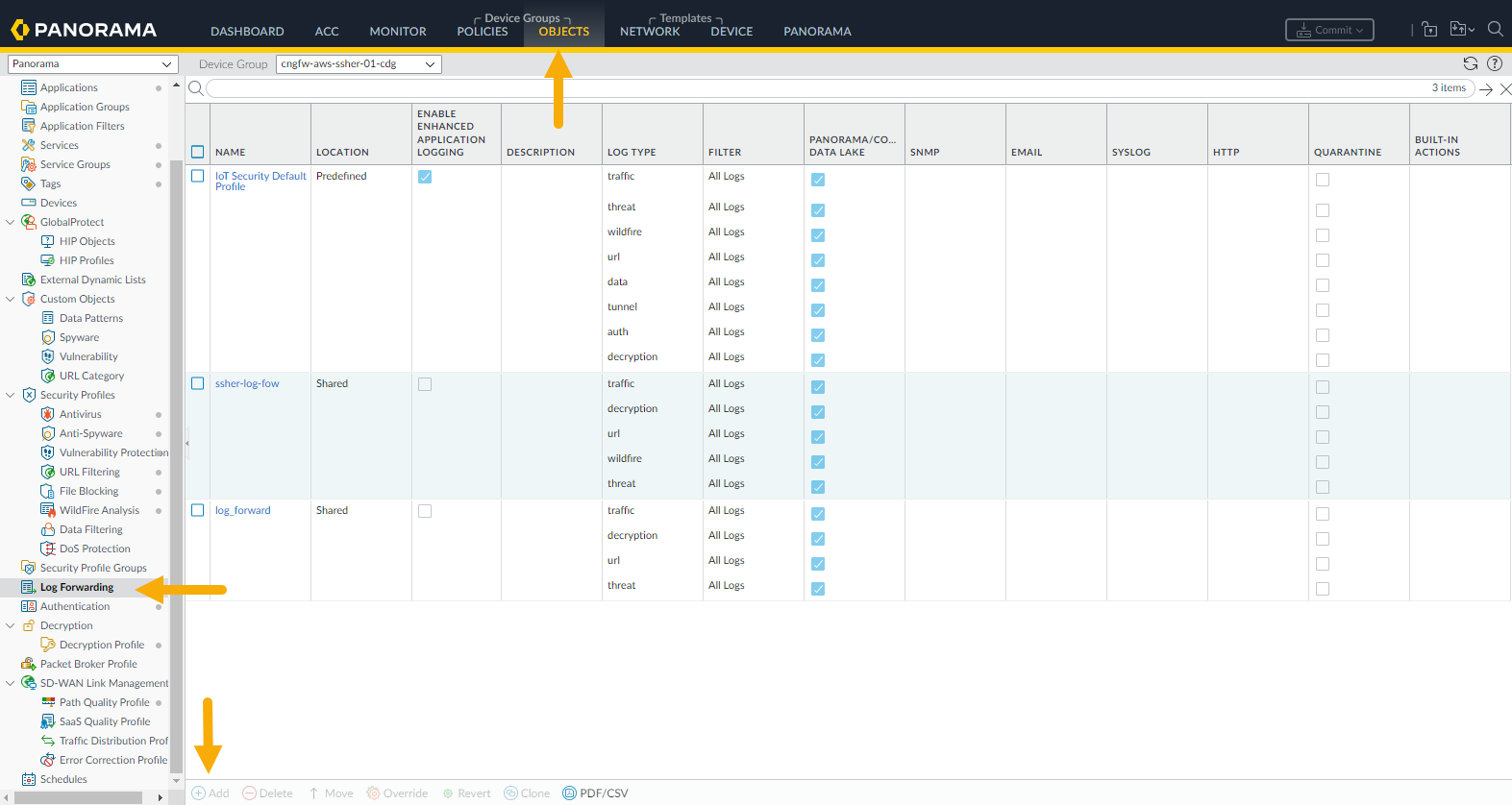 If you're using Panorama and are not using Strata Logging Service for log collection, you can forward logs to another entity, like AWS Cloudwatch, Amazon S3, or Amazon Kinesis.- In the Panorama console, select Objects under Device Groups.Select Log Forwarding.Click Add to create a new log forwarding match list profile.