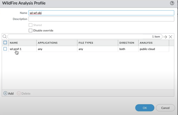 Click Add.Enter a Name for the WildFire profile and click Add.Enter a descriptive Name for any rules you add to the profile.In the application section, click Add to select the application from the list of applications that you wish to allow access through your WildFire profile.Click FileTypes to select the file types you wish to allow.Click Direction to allow download or upload or both options.