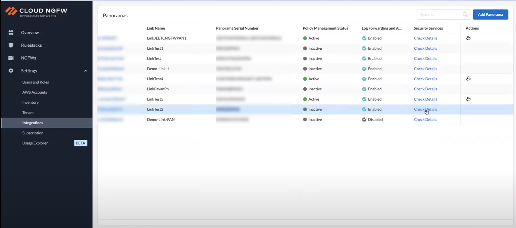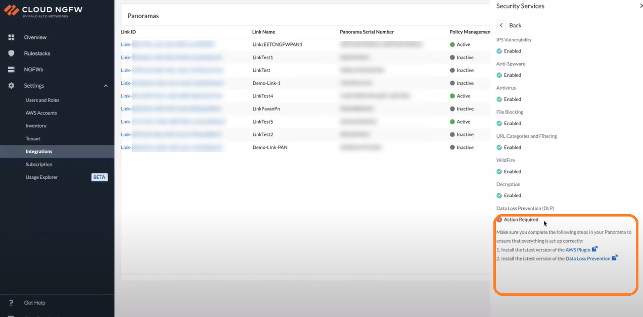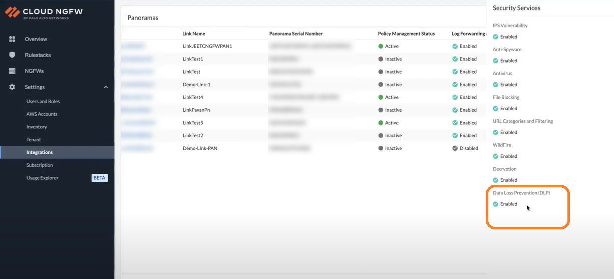 Ensure that the linked Panorama meets the minimum system requirements noted earlier on this page to integrate DLP with your Cloud NGFW service.After you install the required AWS and DLP plugin on your Panorama, the DLP tenant on a Cloud NGFW console gets enabled.On the Cloud NGFW console, go to the Integrations page, select linked Panorama, and then click Check Details under the Security Services column.