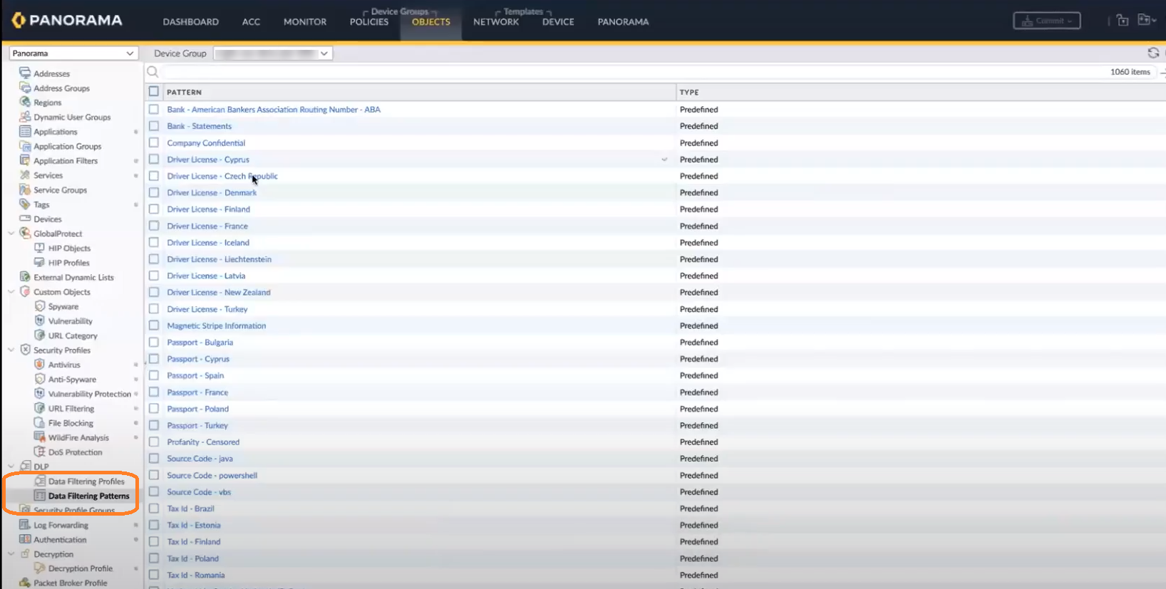 For more information, see Use Panorama for Cloud NGFW Policy Management.After pushing the Security policy rule to your firewall, you can view existing Data Filtering Profiles and Data Filtering Patterns that you can use for your DLP tenant.