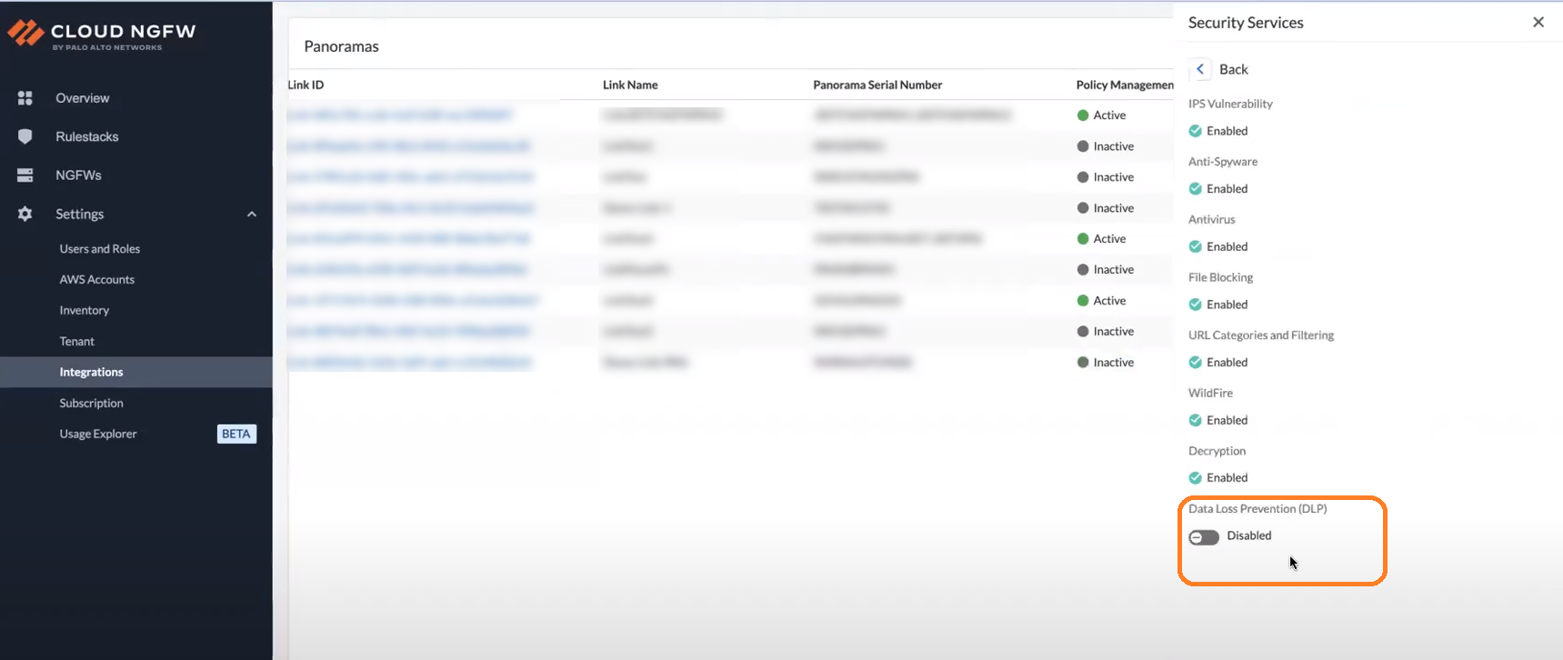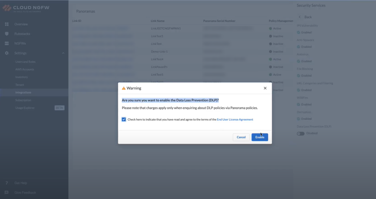 You can also click Link ID of a linked Panorama, and then click Check Details.On the Security Services panel, click Data Loss Prevention (DLP) toggle.