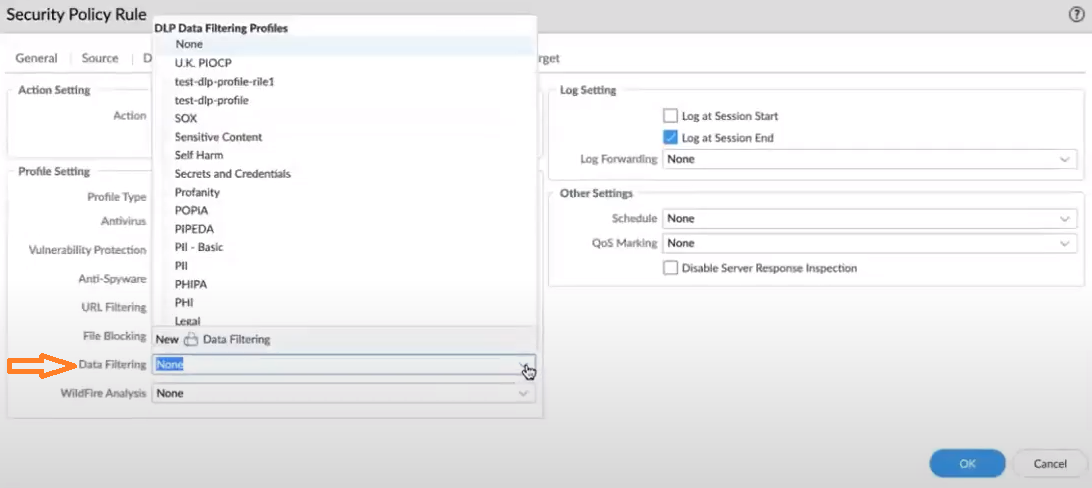 Select a DLP data filtering profile.