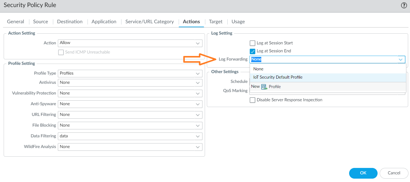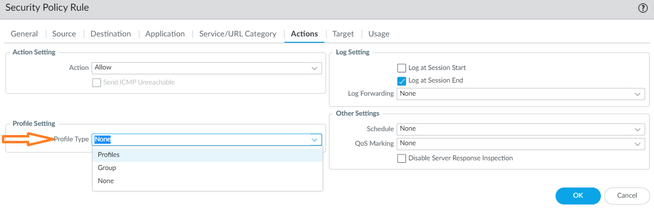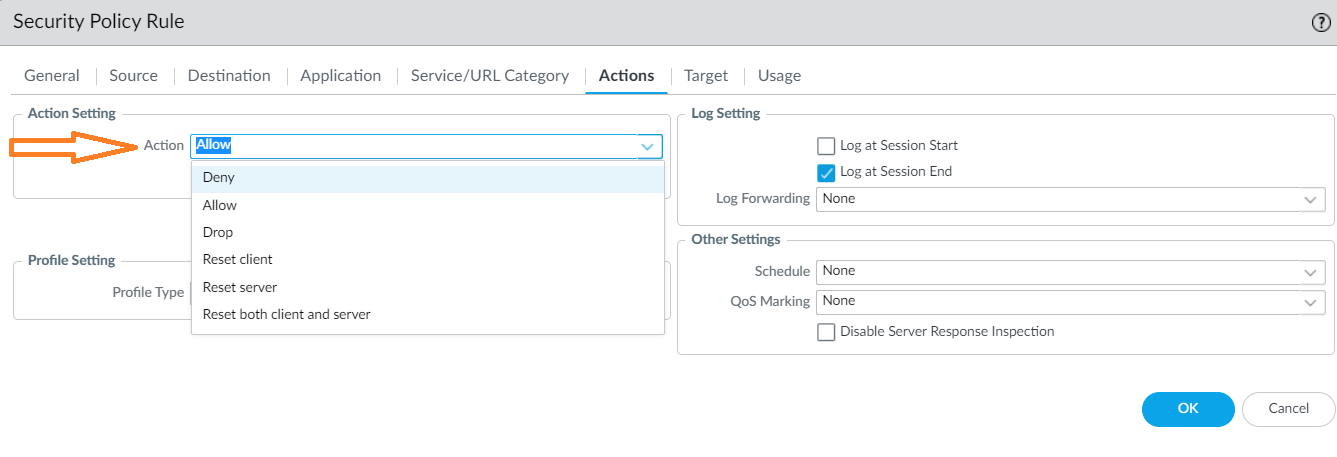 In the Security Policy Rule screen, go to the Actions tab, and then select the action to take (for example, allow or deny).