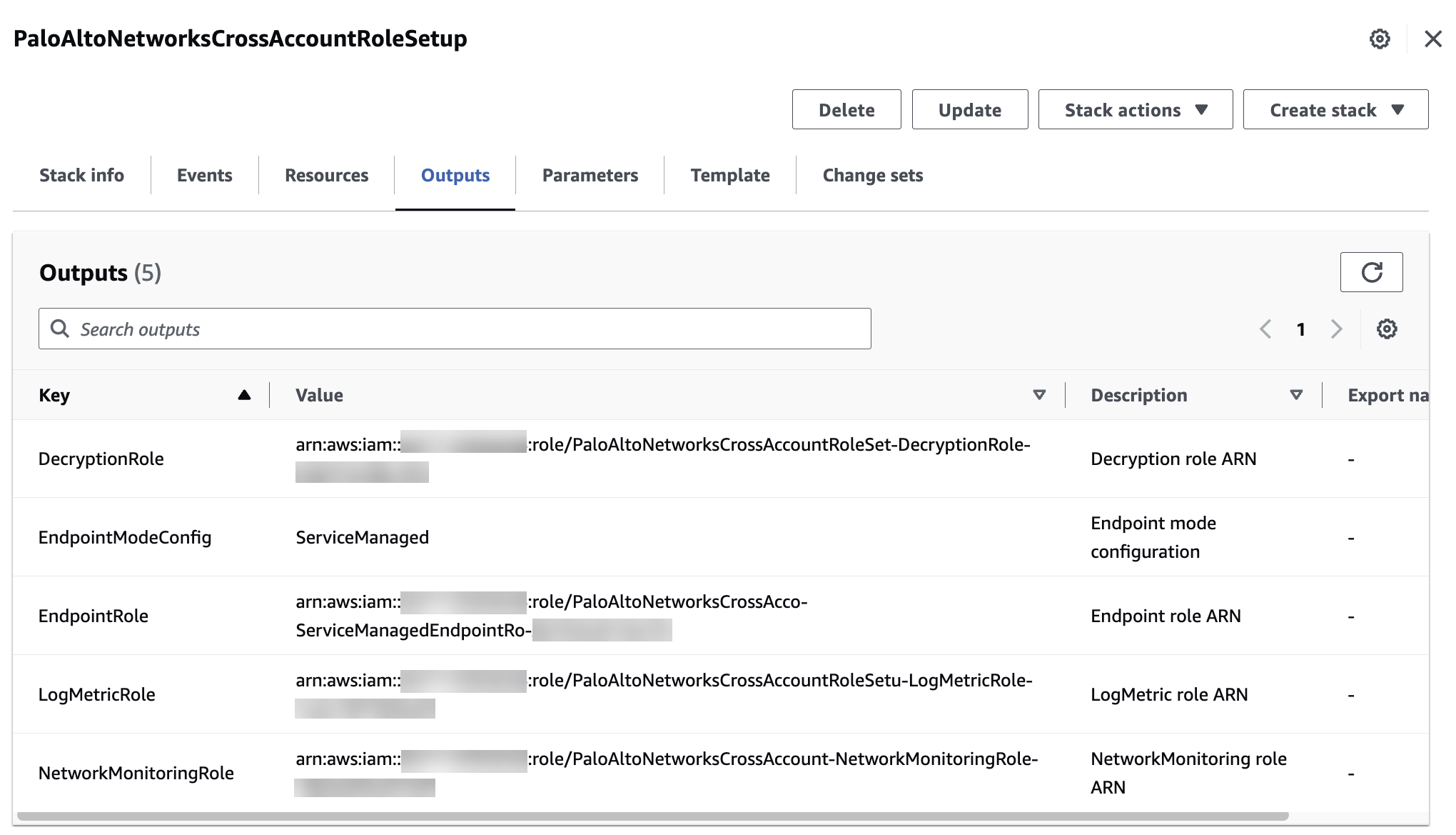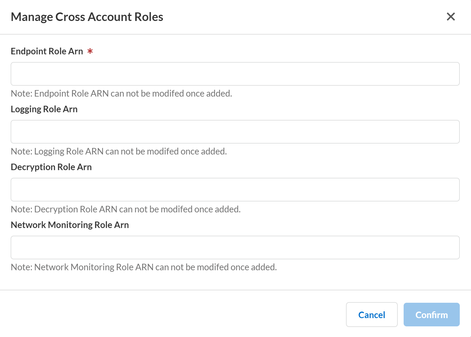 Add the Role ARN values to the Cloud NGFW console:- In the Cloud NGFW console, select Settings > AWS Accounts.Select the radio button corresponding to the AWS account you are adding and select Manage Cross Account Roles from the Actions drop-down.Paste the Role ARN values from the previous step into the corresponding fields.Click Confirm.