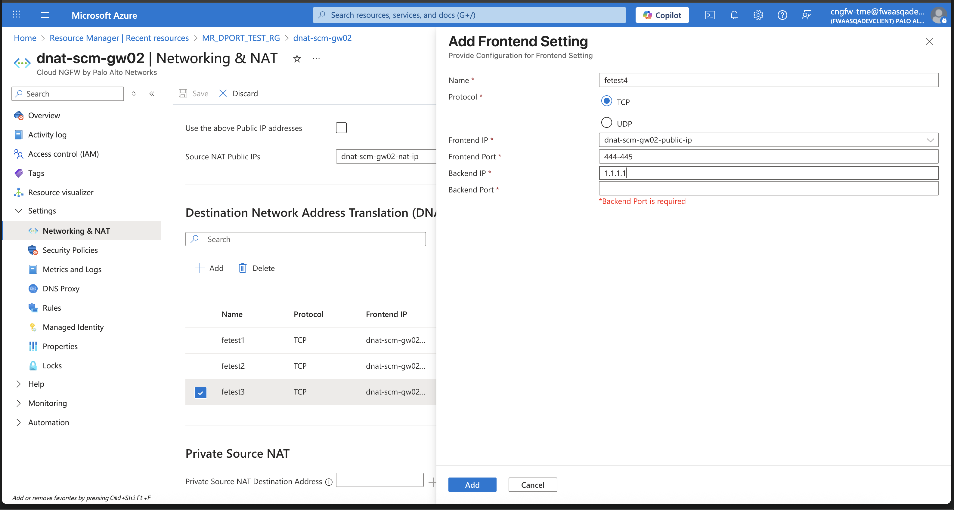 Add a Destination NAT rule. The Front End IP represents the public IP address associated with the Cloud NGFW. Enter a Frontend Port number or a hyphen-separated port range (such as 443-500), then click Add. When using a range, you must also specify a matching symmetrical Backend Port range.