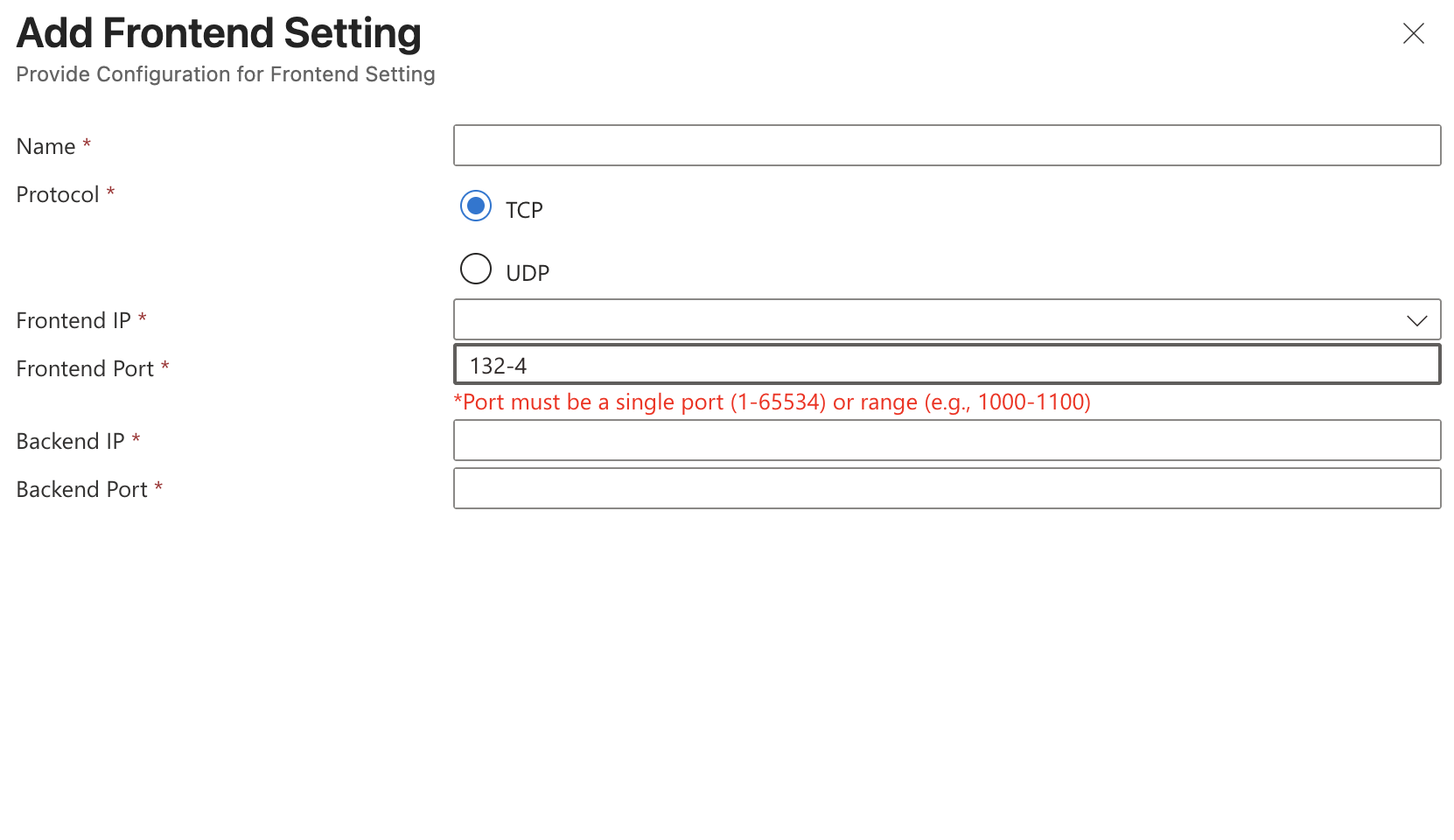 - You can enter either a single port or a range of ports for destination translation. The range defined for the Frontend Port must exactly match the range defined for the Backend Port. Mismatched ranges will result in a Bad Request error.