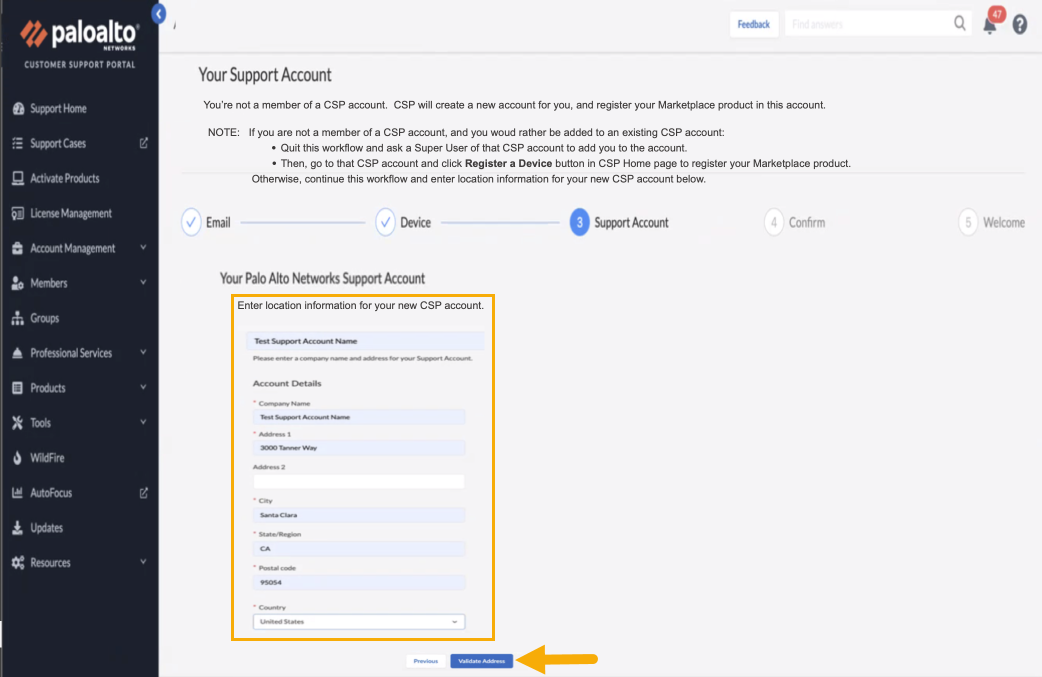 Create your support account. Enter Account Details, then click Validate Address.