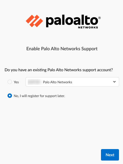 If you don't have an existing Palo Alto Networks support account, you’ll be prompted to secure one prior to using your Cloud NGFW tenant.- Log in to the Cloud NGFW resource.In the Enable Palo Alto Networks Support page, select No.Click Next.