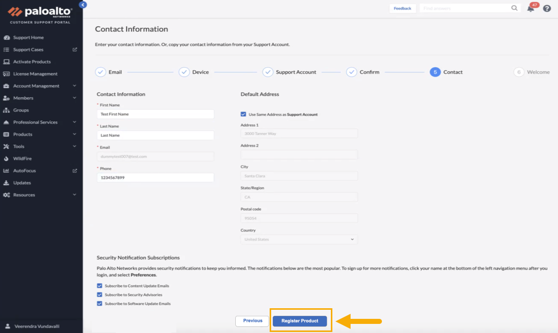 Confirm your email address for your Customer Support Portal account, then click Next.Verify your Contact Information. Select your Security Notification Subscriptions, then click Register Product