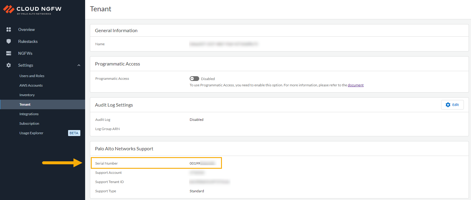 To locate the Cloud NGFW serial number:- Log in to the Cloud NGFW tenant.Click Tenant. The Tenant page displays the Serial Number and additional information in the Palo Alto Networks Support section.