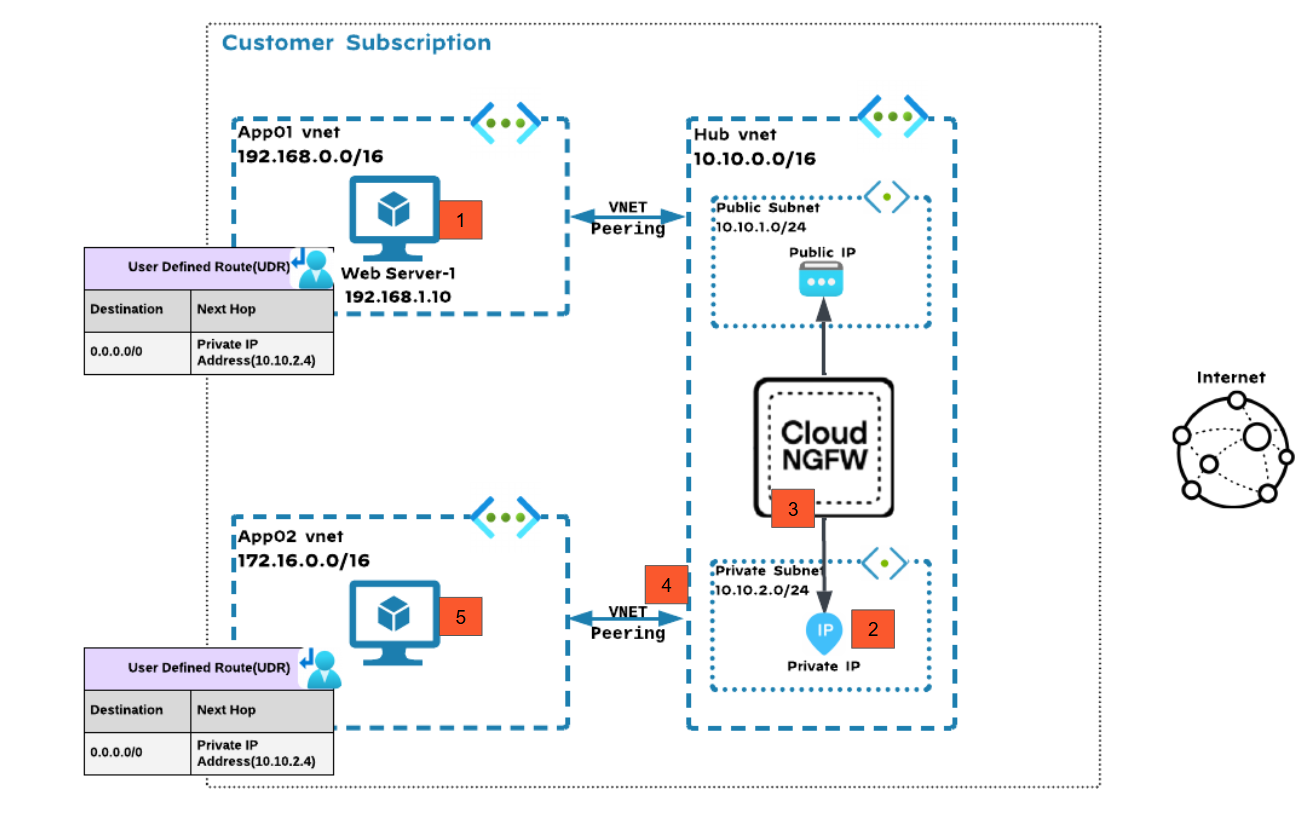 - Traffic from a App01 VNet workload VM is destined for the internet.Traffic from the spoke VM is forwarded to the private IP address of the Cloud NGFW using the User-Defined Route (UDR) associated with the workload subnet.Since the private IP address was internally associated with the Cloud NGFW, the packet arrives at the Cloud NGFW for inspection.After inspection, Cloud NGFW performs source NAT by changing the private IP address to the public IP address of the Cloud NGFW.After performing SNAT, the traffic is sent to the actual internet destination.
