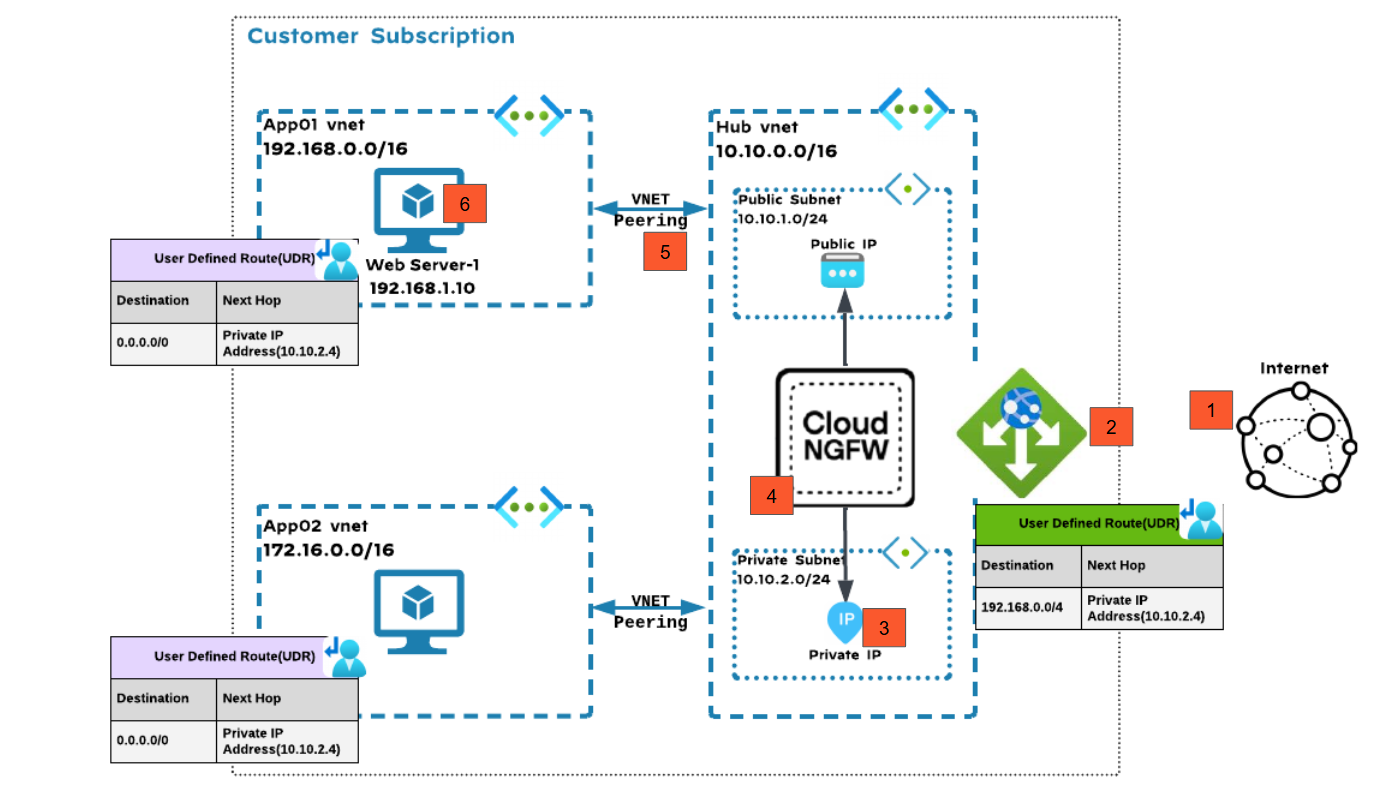 In this deployment model:- Internet inbound web traffic is routed to the App-01 web server through an App Gateway and the Cloud NGFW to achieve zero trust security.Traffic from the internet lands on the front-end IP of the Application Gateway for which the App-01 Web server acts as the backend pool.Configure UDR on the App Gateway subnet with the next hop as the Cloud NGFW private IP address.The packet arrives at the Cloud NGFW for inspection.After inspection, Cloud NGFW sends the allowed traffic to the web server using VNet peering.The web server and it uses UDR to redirect the response traffic to the Cloud NGFW for inspection.