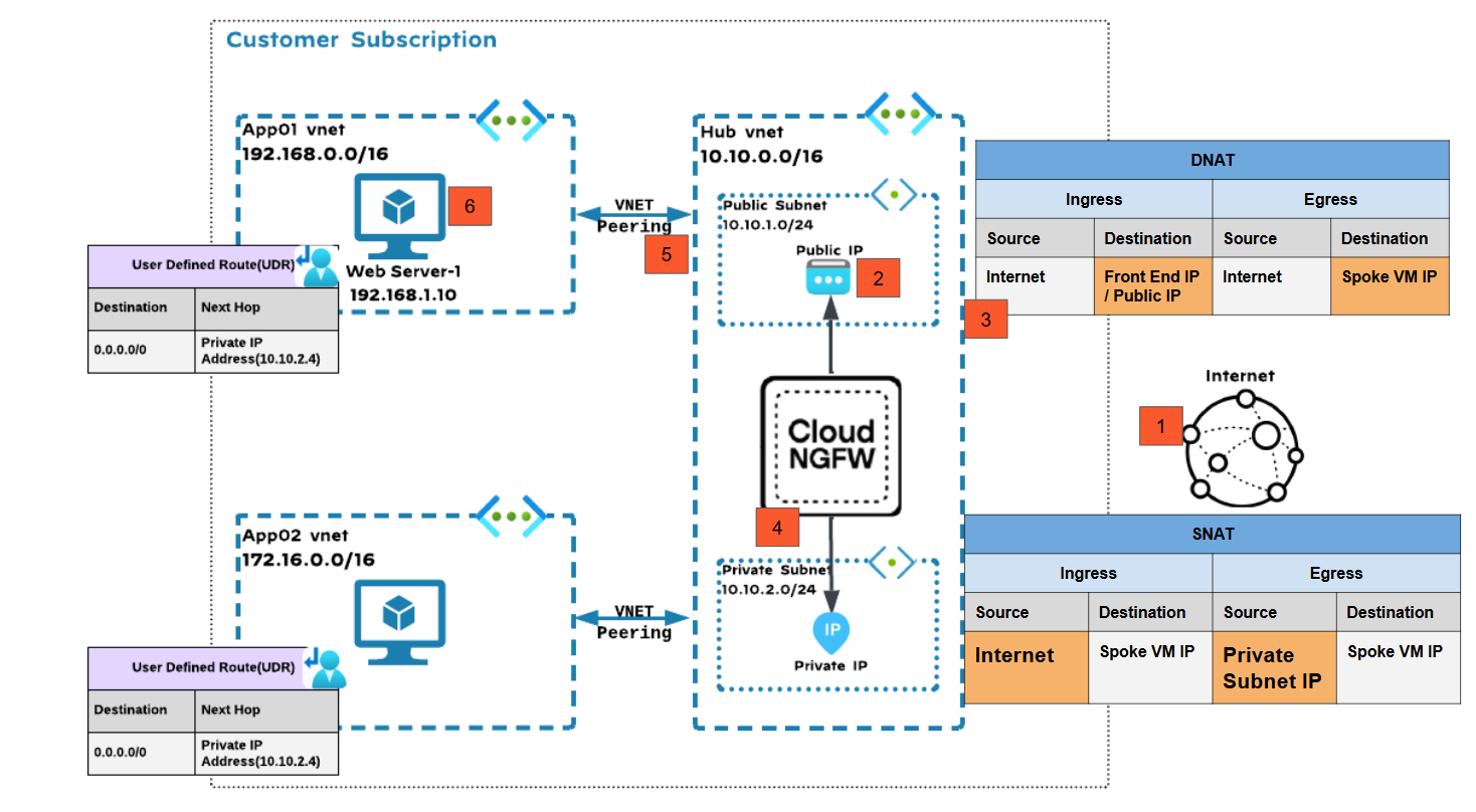 In this deployment model:- Traffic is destined from the internet to Web server-1 in App01 VNet.Traffic from the internet lands on the front-end or public IP address of the Cloud NGFW.The Cloud NGFW performs destination NAT is changed from the public IP address to the actual spoke VM IP address.After inspecting the traffic, the Cloud NGFW performs source NAT using the private IP address subnet.Traffic is sent to the actual destination across the VNet peering connection.Traffic with the source IP address as one of the IP addresses from within the private subnet and the destination IP address as the spoke VM IP arrives at the web server.