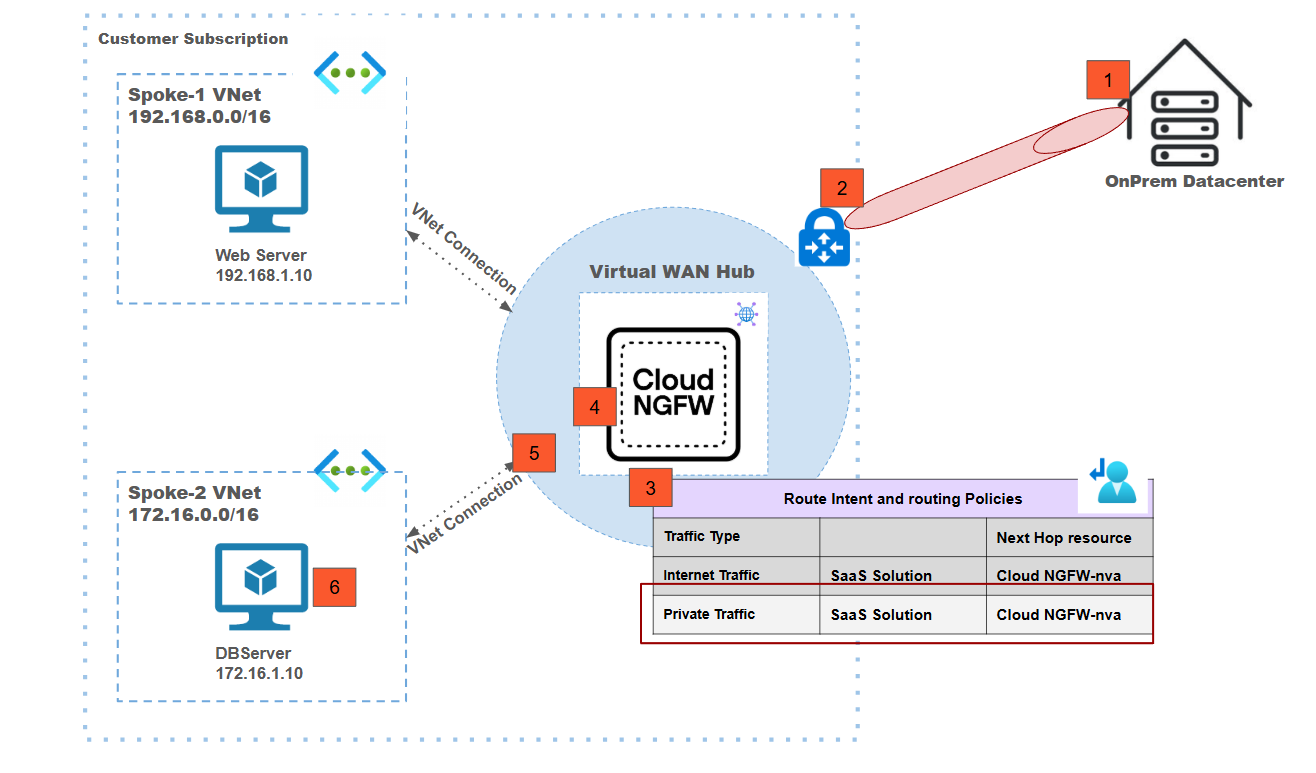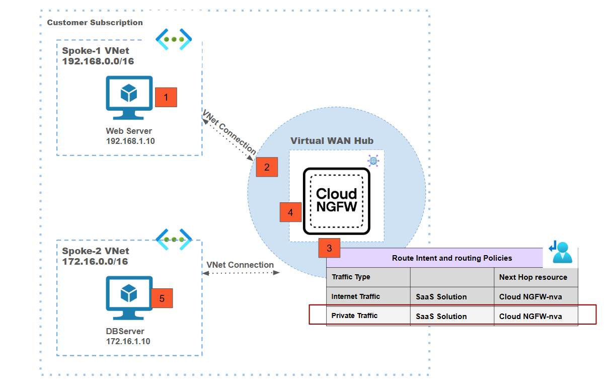In this deployment model:- Traffic from a spoke-1 Webserver connected to the vWAN hub-1 is destined to the spoke-2 DB server connected to the vWAN hub-2.Traffic from Webserver-1 arrives at the vWAN hub-1 because of the VNet connection.Routing intent configured for private traffic in hub-1 redirects traffic to the Cloud NGFW for inspection.Post inspection, traffic is sent back to vWAN hub-1.Since the destination of the traffic is connected to vWAN hub-2, using the hub-to-hub connectivity the traffic is forwarded to vWAN hub-2.Traffic is received at vWAN hub-2.Routing intent sends the traffic to the Cloud NGFW connected to hub-2 for inspection.Post inspection, the traffic is sent back to hub-2.Using the VNet connection, the vWAN forwards the traffic to the VM in spoke-2 which is the actual destination.