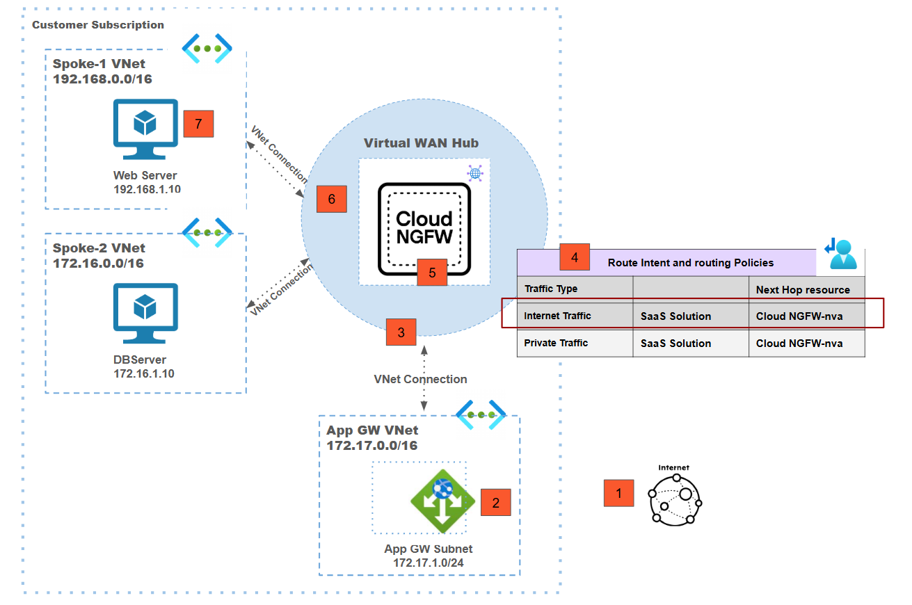 - Traffic from a the spoke1 VNet workload VM is destined for the internet.Traffic destined to the internet from the spoke-1 web server VM is forwarded to the vWAN hub using the VNet connection.Routing intent on the vWAN hub is used to redirect traffic from the vWAN hub to the Cloud NGFW.Routing intent is enabled for internet traffic with the Cloud NGFW as a next hop to redirect internet egress traffic to the Cloud NGFW for inspection.Post inspection source NAT is performed on the Cloud NGFW using the public IP address associated with the Cloud NGFW.Traffic is now sent out onto the internet.