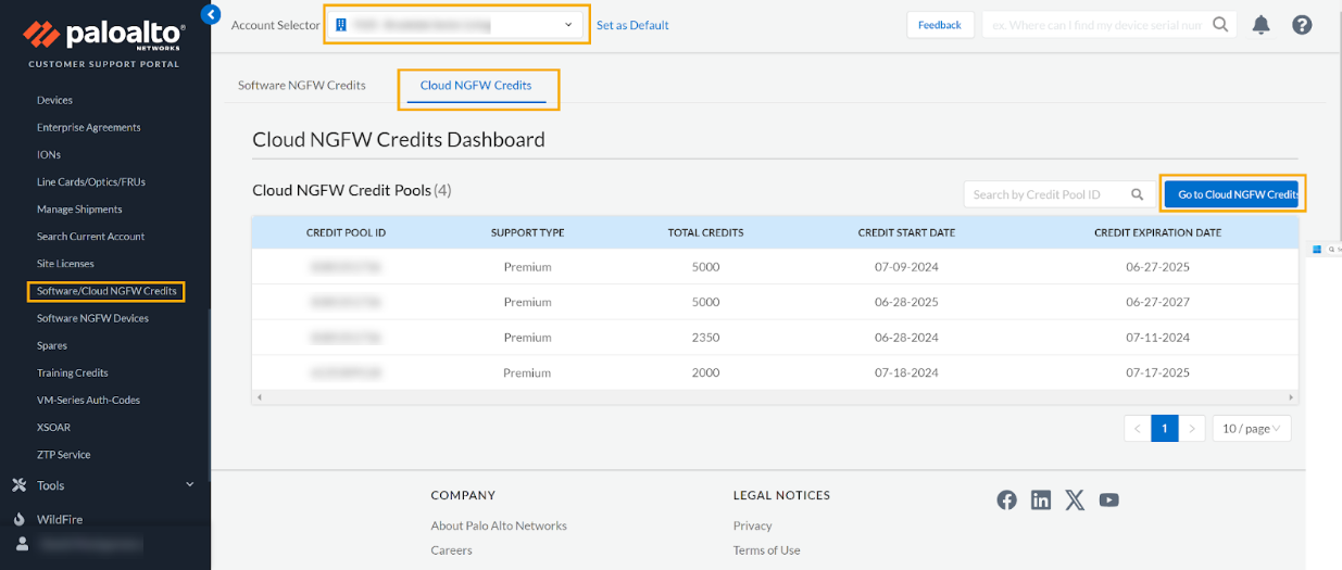 - Log in to the Palo Alto Networks Customer Support Portal.In the portal, select Product.Select Software and Cloud NGFW credits.Use the Account Selector to ensure that you’re viewing the correct account, then click the Cloud NGFW credits tab to display the credit pools associated with the account.Click Go to Cloud NGFW Credits to access the Cloud NGFW Credit Management application in the Palo Alto Networks hub.