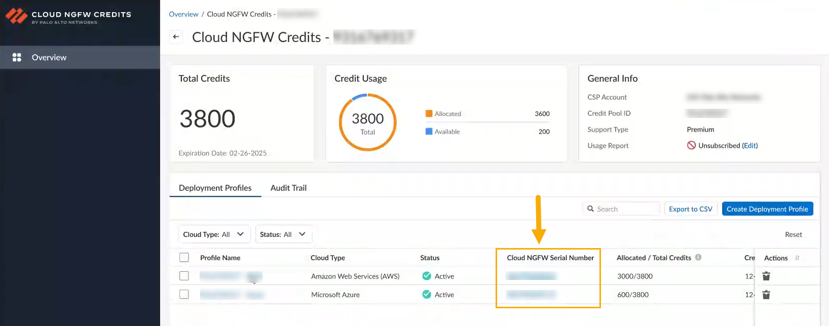 The Cloud NGFW Credits page provides access to credit visibility functionality. To access it, select the Cloud NGFW serial number associated with the deployment profile you want to view.The Cloud NGFW Credits page provides access to the credit visibility functionality. To access it, select the Cloud NGFW serial number associated with the deployment profile you want to view.