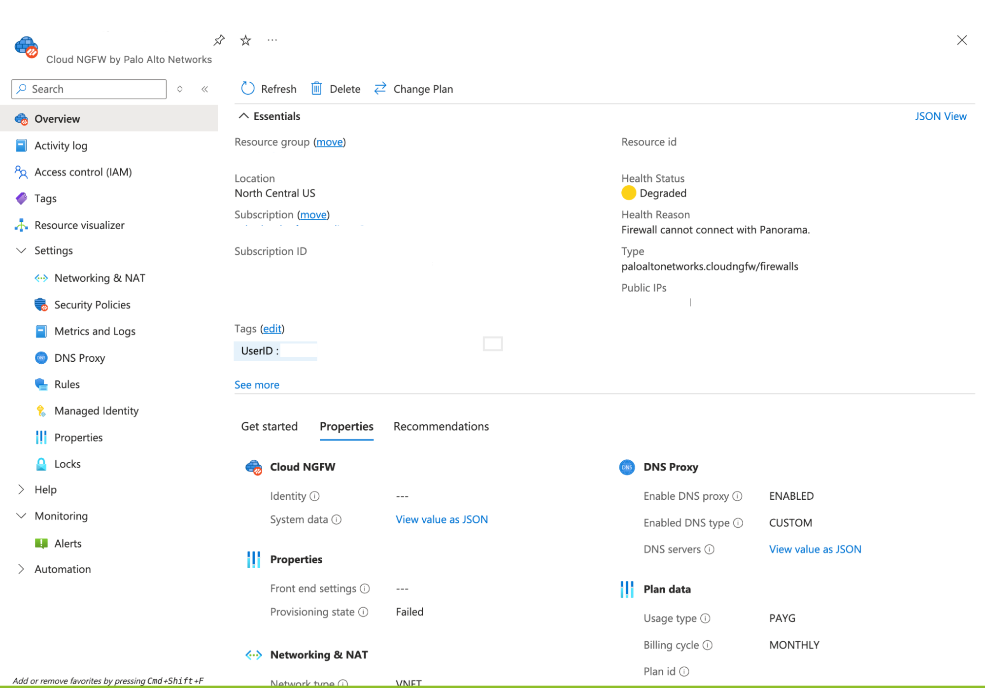 Check the Health Status of the Cloud NGFW for Azure resource in the Azure portal. Look for these common failure indicators: