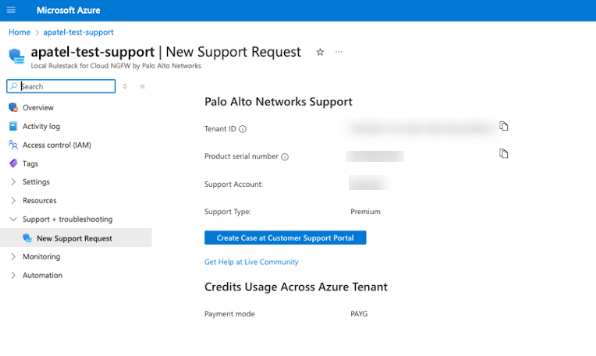 Alto Networks Customer Support Portal using the Azure portal: