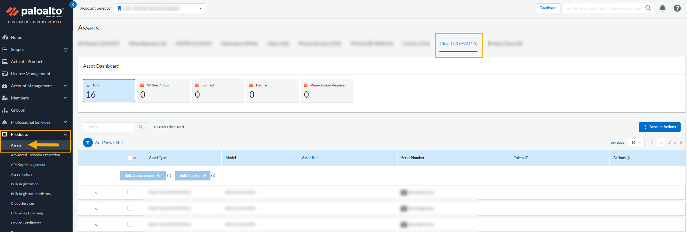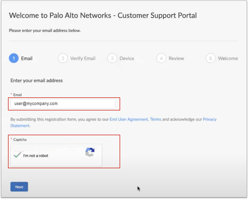 When you select the option to Register User account and create a case at Customer Support Portal in the Azure portal you're directed to the Customer Support Portal where you will enter your login credentials. You can use your existing Customer Support Portal login credentials, or create a new Customer Support Portal login account. Enter your email address and resolve the Captcha, then click Next.![]() After entering your email address, the Customer Support Portal determines if you have an existing account, or if you need a new one. If you have Palo Alto Networks products associated with the email address you have entered, information for the Cloud Marketplace (Tenant ID and Serial Number) appear. Click Next to log in to the Customer Support Portal and continue with the registration process. After entering your email address, the Customer Support Portal determines if you have an existing account, or if you need a new one. If you have Palo Alto Networks products associated with the email address you have entered, information for the Cloud Marketplace (Tenant ID and Serial Number) appear. Click Next to log in to the Customer Support Portal and continue with the registration process.![]() Follow the prompts to complete the rest of the registration process.For existing accounts, registration information is prepopulated. For new Customer Support Portal accounts you will be prompted to set up the account (for example, which Palo Alto products you use).Once registration is complete a success message appears. You can use the Customer Support Portal to verify this by selecting Products > Assets. In the Assets page, select the Cloud NGFW tab: Follow the prompts to complete the rest of the registration process.For existing accounts, registration information is prepopulated. For new Customer Support Portal accounts you will be prompted to set up the account (for example, which Palo Alto products you use).Once registration is complete a success message appears. You can use the Customer Support Portal to verify this by selecting Products > Assets. In the Assets page, select the Cloud NGFW tab:![]() You can use the Azure portal to verify that the Cloud NGFW tenant is now registered. In the Azure portal navigate to Support and Troubleshooting: You can use the Azure portal to verify that the Cloud NGFW tenant is now registered. In the Azure portal navigate to Support and Troubleshooting:![]() The Tenant ID and Product serial number now reflect the link between the Palo Alto Networks Customer Support Portal and Azure portal. The Tenant ID and Product serial number now reflect the link between the Palo Alto Networks Customer Support Portal and Azure portal.