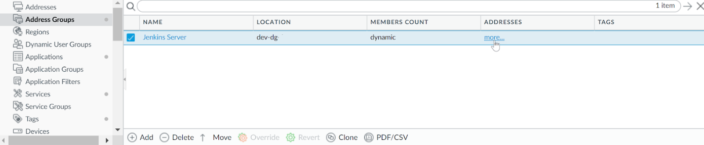 Use the more... link to view the IP addresses associated with the object, the Jenkins servers in your cluster in this example.Create Security Policy rules for traffic enforcement.- Select PoliciesSecurity.Click Add and enter a Name and a Description for the policy.Add the Source Zone to specify the zone from which the traffic originates.Add the Destination Zone at which the traffic is terminating.For the Destination Address, select the Dynamic address group you just created.Specify the action— Deny—for the traffic, and optionally attach the default security profiles to the rule.Select Actions and select the Log Forwarding profile you created.Click Commit.