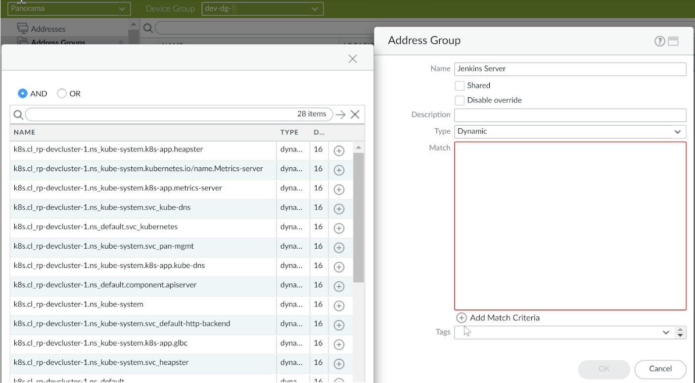 Set up the Dynamic Address Groups.- Select your Device Group for managing the CN-NGFW pods.Select ObjectsAddress Groups.Click Add and enter a Name and a Description for the address group.Select Type as Dynamic.Click Add Match Criteria, and select the AND or OR operator and select the attributes that you would like to filter for or match against.