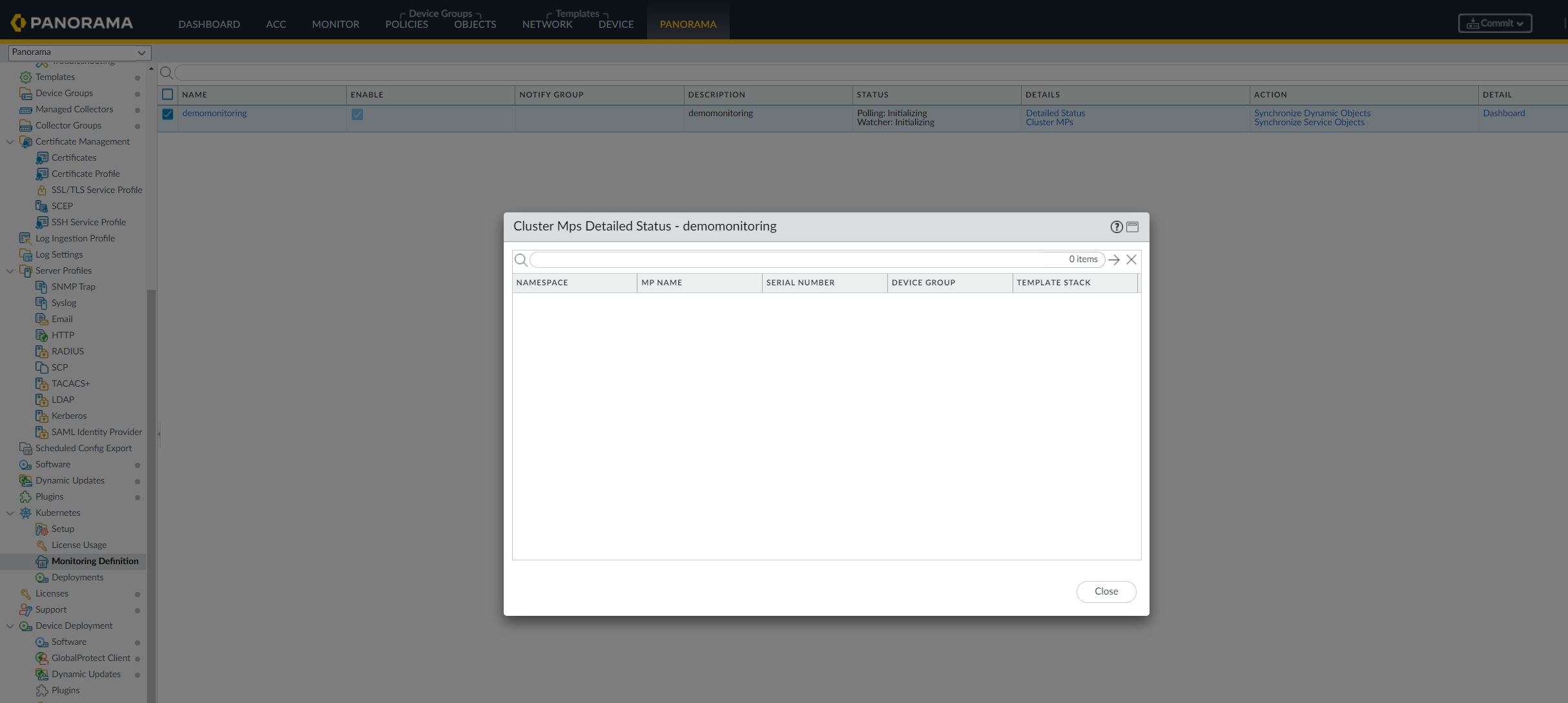 Create a Monitoring Definition in the Panorama plugin.Use the Cluster and Notify Group definitions created in the previous steps.Commit to Panorama.To confirm API connectivity and MP container registrations, go to the Monitoring Definition and click on the Detailed Status and Cluster MPs.You are now ready to deploy an application and secure it with the CN-Series firewall.