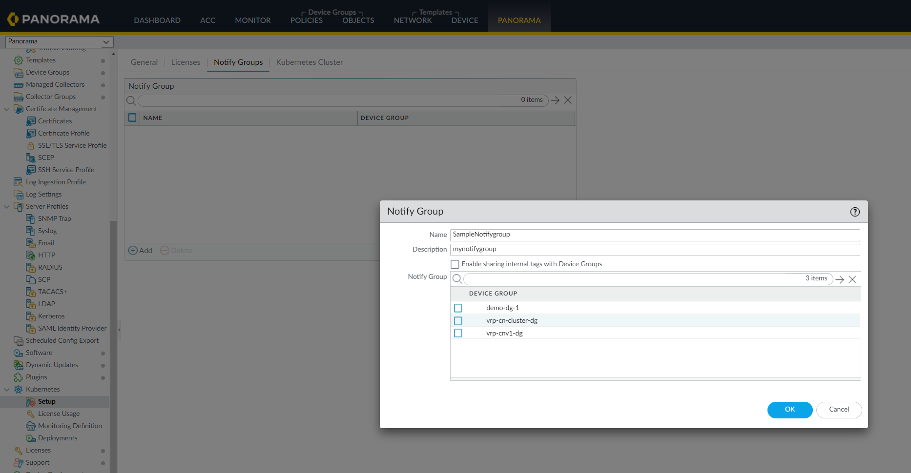 - Retrieve the pan-plugin-user service account credentials from the Kubernetes master.Enter each command as a single line:$ MY_TOKEN=`kubectl get serviceaccounts pan-plugin-user -n kube-system-o jsonpath='{.secrets[0].name}'`$ kubectl get secret $MY_TOKEN -n kube-system -o json >~/Downloads/pan-plugin-user.jsonCreate a Cluster definition in the Panorama Kubernetes plugin.Use the Kubernetes master address displayed in the Terraform output and the JSON credentials file located at ~/Downloads/pan-plugin-user.json.Define the labels you want to import from the Kubernetes API.Create a Notify Group definition in the Panorama Kubernetes plugin.This definition is used to propagate the labels learned from the Kubernetes API to a Panorama Device Group.Perform the following steps to create a Notify Group in the Panorama Kubernetes plugin: