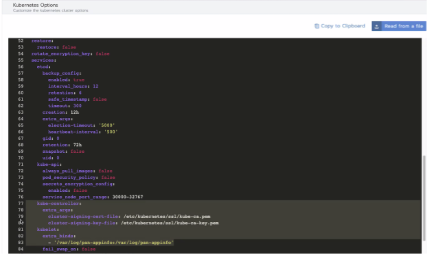 kube-controller: extra_args: cluster-signing-cert-file: "/etc/kubernetes/ssl/kube-ca.pem" cluster-signing-key-file: "/etc/kubernetes/ssl/kube-ca-key.pem"