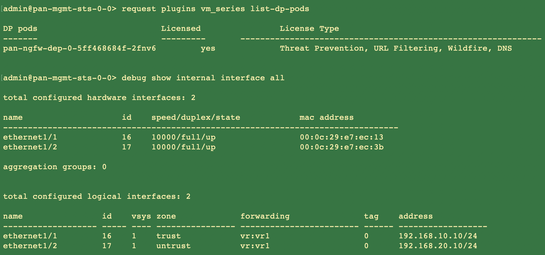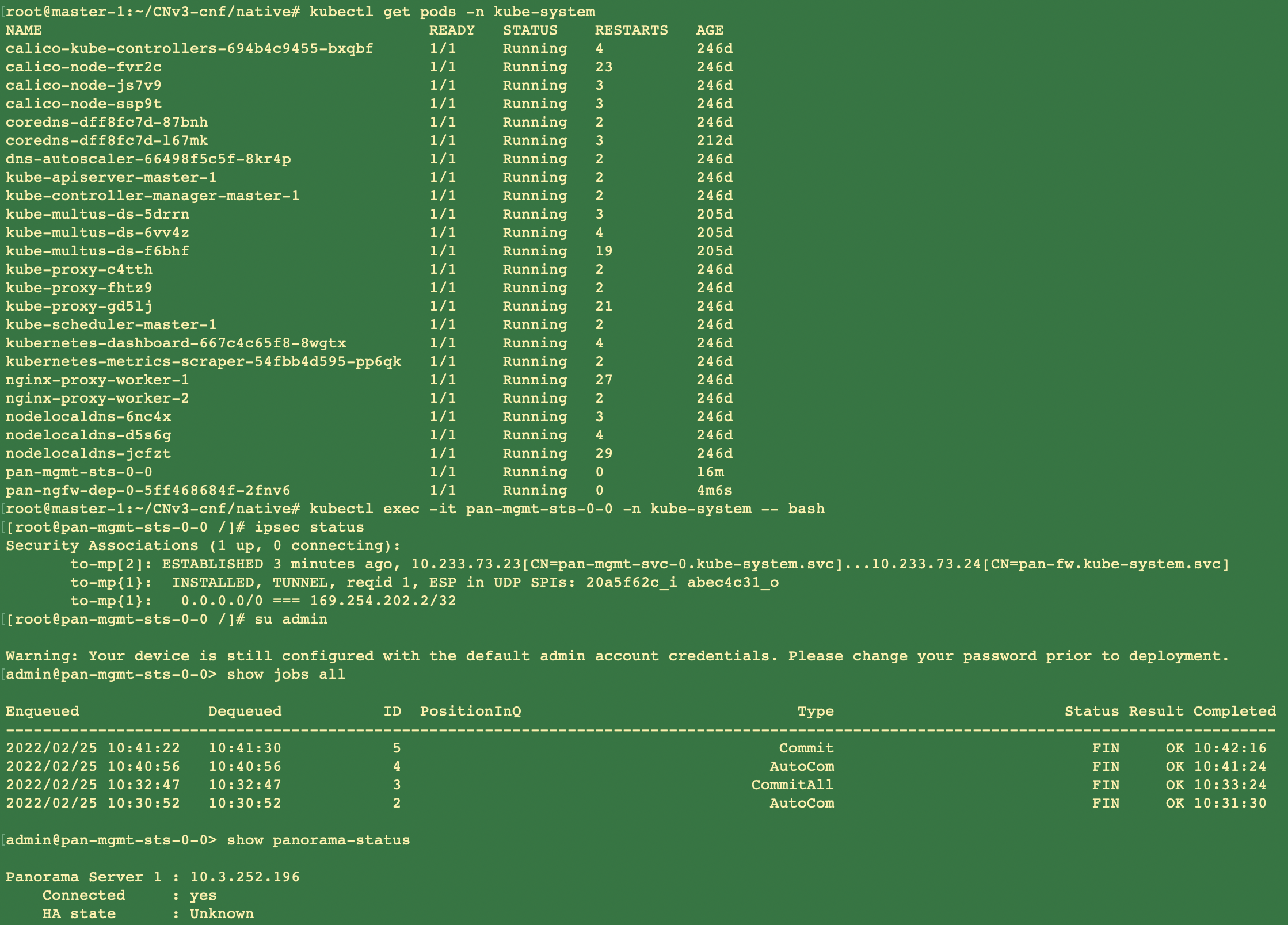 - Verify that you have modified the YAML files as detailed in PAN-CN-NGFW-CONFIGMAP-0 and PAN-CN-NGFW-0.containers: - name: pan-ngfw-container image: <your-private-registry-image-path>Use Kubectl apply to run the pan-cn-ngfw-configmap.yaml.kubectl apply -f pan-cn-ngfw-configmap.yamlUse Kubectl apply to run the pan-cn-ngfw.yaml.kubectl apply -f pan-cn-ngfw.yamlVerify that the CN-NGFW Pods are running.kubectl get pods -n kube-system -l app=pan-ngfw -o wideVerify that you can see CN-MGMT and CN-NGFW on the Kubernetes cluster. Run the following command:kubectl -n kube-system get pods
