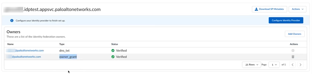 The additional owners who are added by the original owner are of the “Owner Grant” type and they are automatically verified. They do not have to be verified by TXT record like the original owner.Delete an Identity Federation Owner