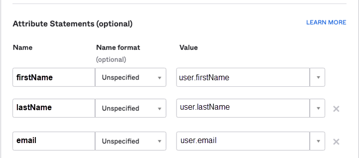 In your identity provider’s console, set up the Attribute Statements for firstName of user.firstName, lastName of user.lastName, and email of user.email. Without them, you will only see a blank name in the hub or Strata Cloud Manager. The console details look similar to the following, but all providers are slightly different.