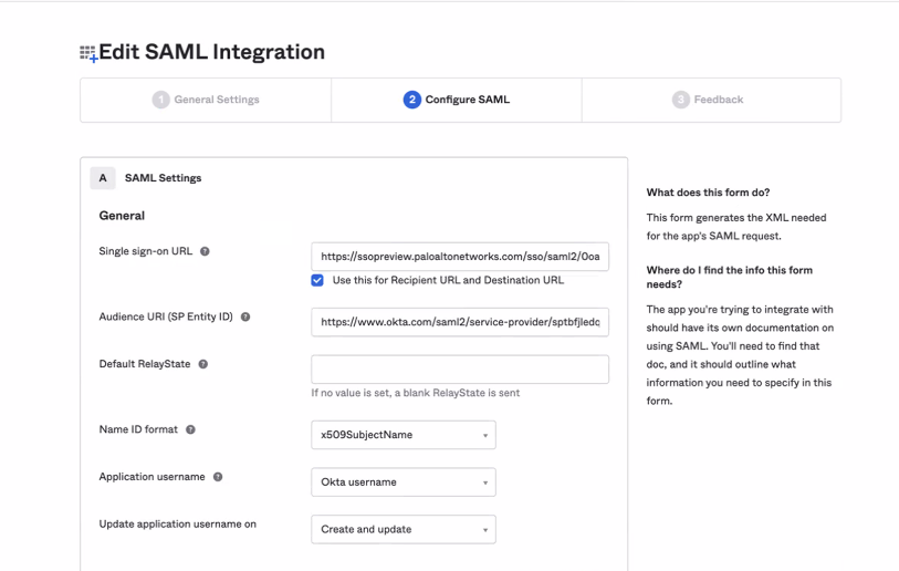 Upload Certificate for your identity provider certificate. Use .crt files only.Enter your Identity Provider ID.Enter your Identity Provider SSO URL.Select Next.The Configure Identity Provider button is replaced with the Login URL that you configured. The Login URL is how Palo Alto Networks knows where to send the user when they log in. This is disabled by default. Select ActionsEnable.