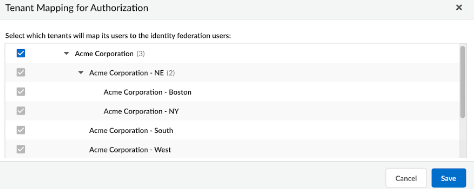 Select which tenants can map users to the identity federation users and Save.Inheritance applies the same way as it does in access management. If you map a tenant at the top level of the hierarchy, the child tenants nested below it will inherit the mapping so that the parent can manage them.