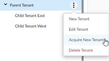 - Use one of the various ways to access Settings.Select Tenants.From the parent tenant where you will manage your newly acquired target tenant, select Acquire New Tenant.
