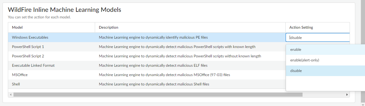 - enable—WildFire inspects traffic according to your selections in the WildFire Inline ML Action column in the decoders section of the Action tab.