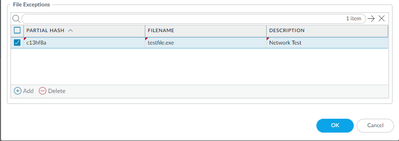 - The new file exception can be found File Exceptions list under Objects > Security Profiles > Antivirus > WildFire Inline ML.